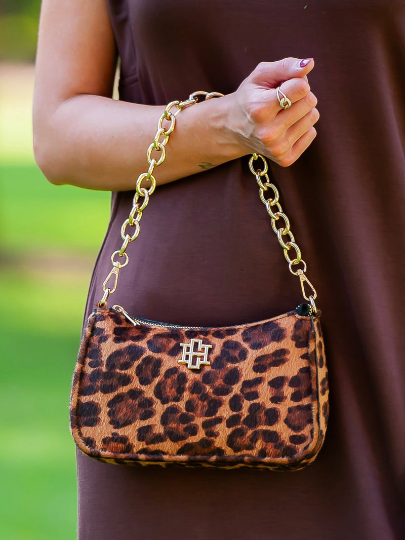 This slightly metallic, leopard print purse is your go-to glam. Made of textured vegan leather, this convertible handbag comes with two removable straps — a gold chain for carrying and an adjustable crossbody. Top zipper closure, plus inside pockets to keep things tidy.