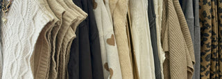a wool taupe brown colored triangle wrap layered over a white turtleneck