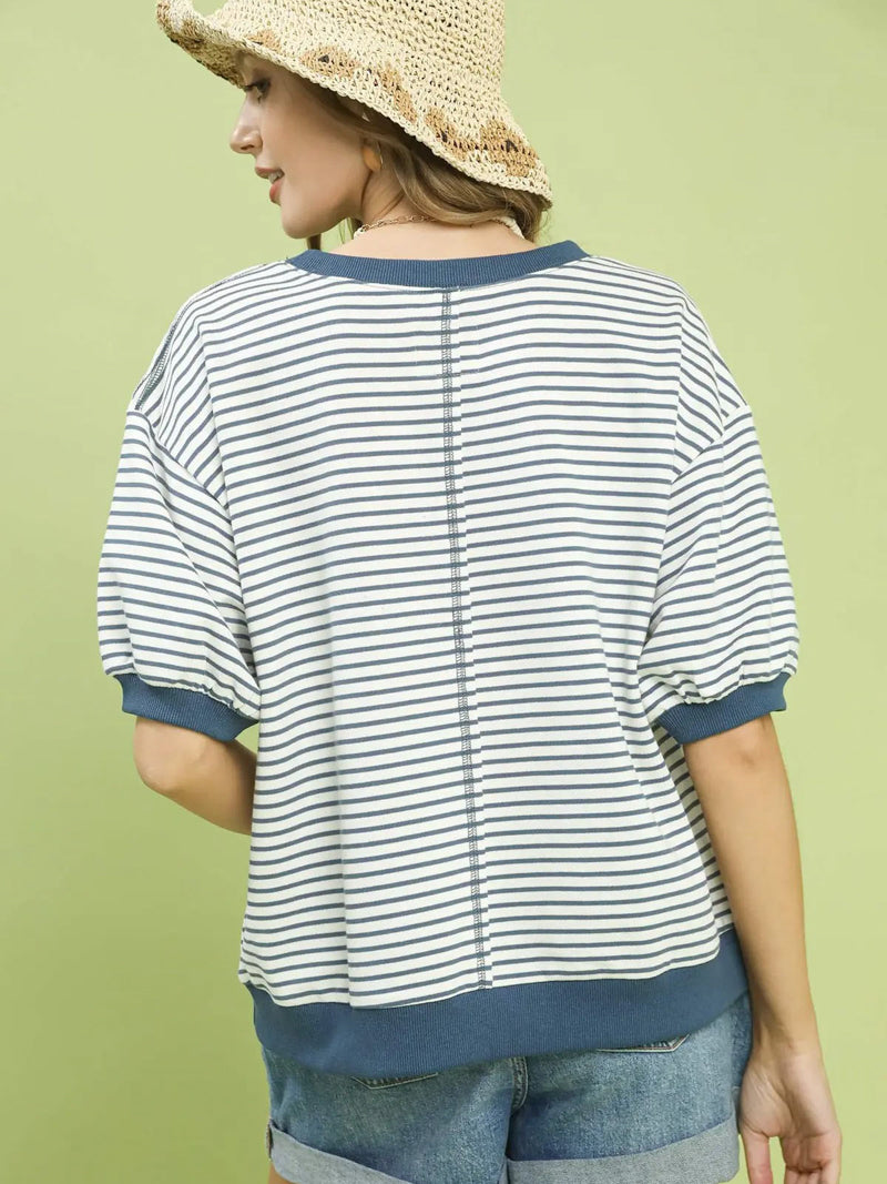 This french terry top in a denim blue stripe is made for laid-back days with extra charm. It features a comfy ribbed crew neck, short puff sleeves for a playful touch, and contrast cuffs edges that give it a polished finish. Easy, cozy, and effortlessly stylish.