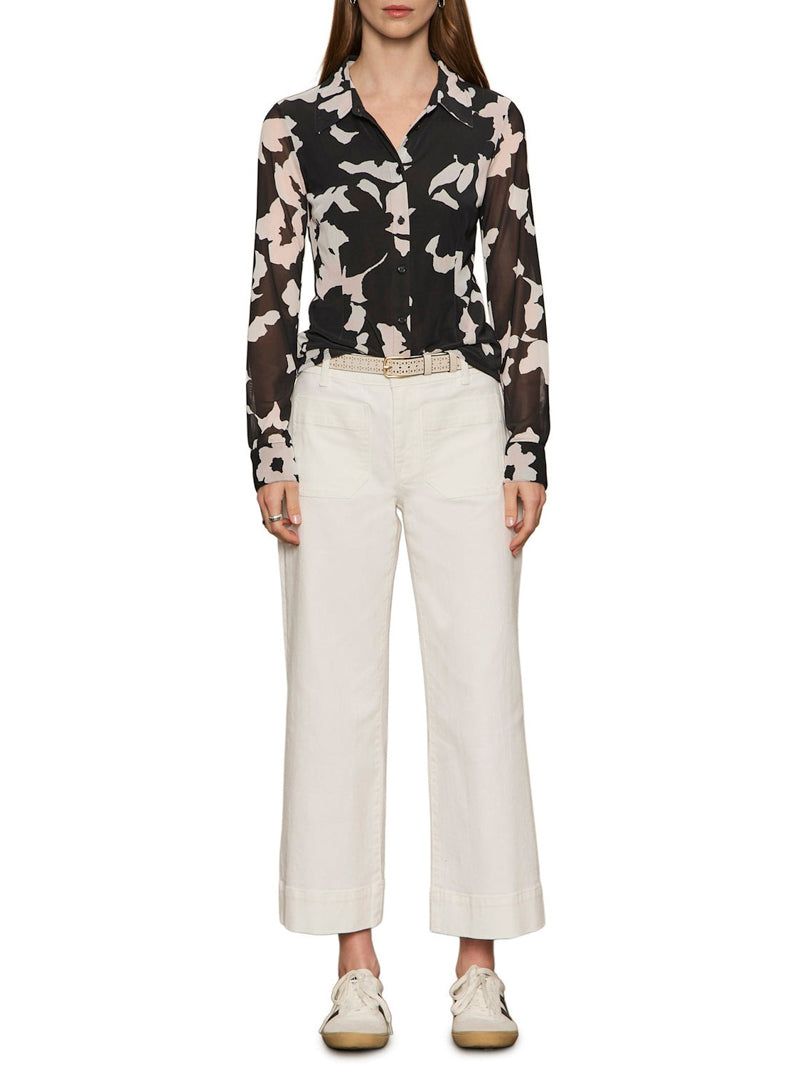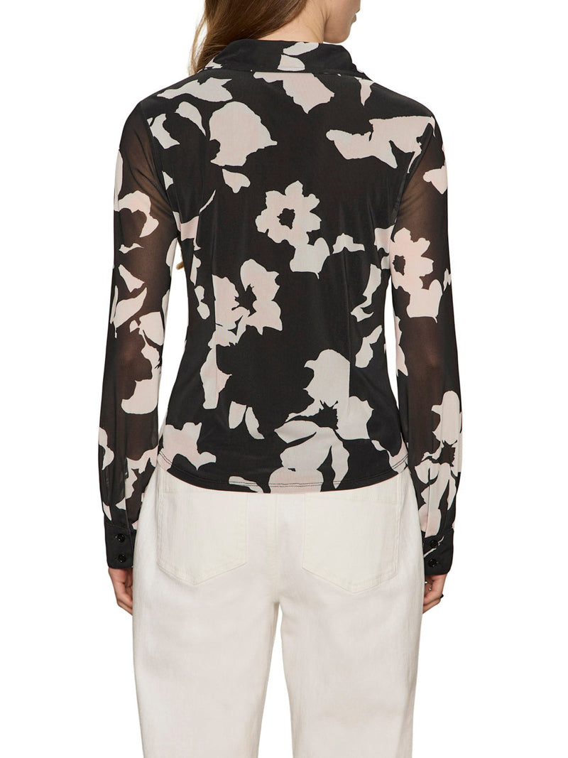 Discover your fashion-forward side with this black floral fitted mesh button down top. Versatile enough for layering, this chic blouse boasts long mesh sleeves and sheer accents that add an edgy touch.