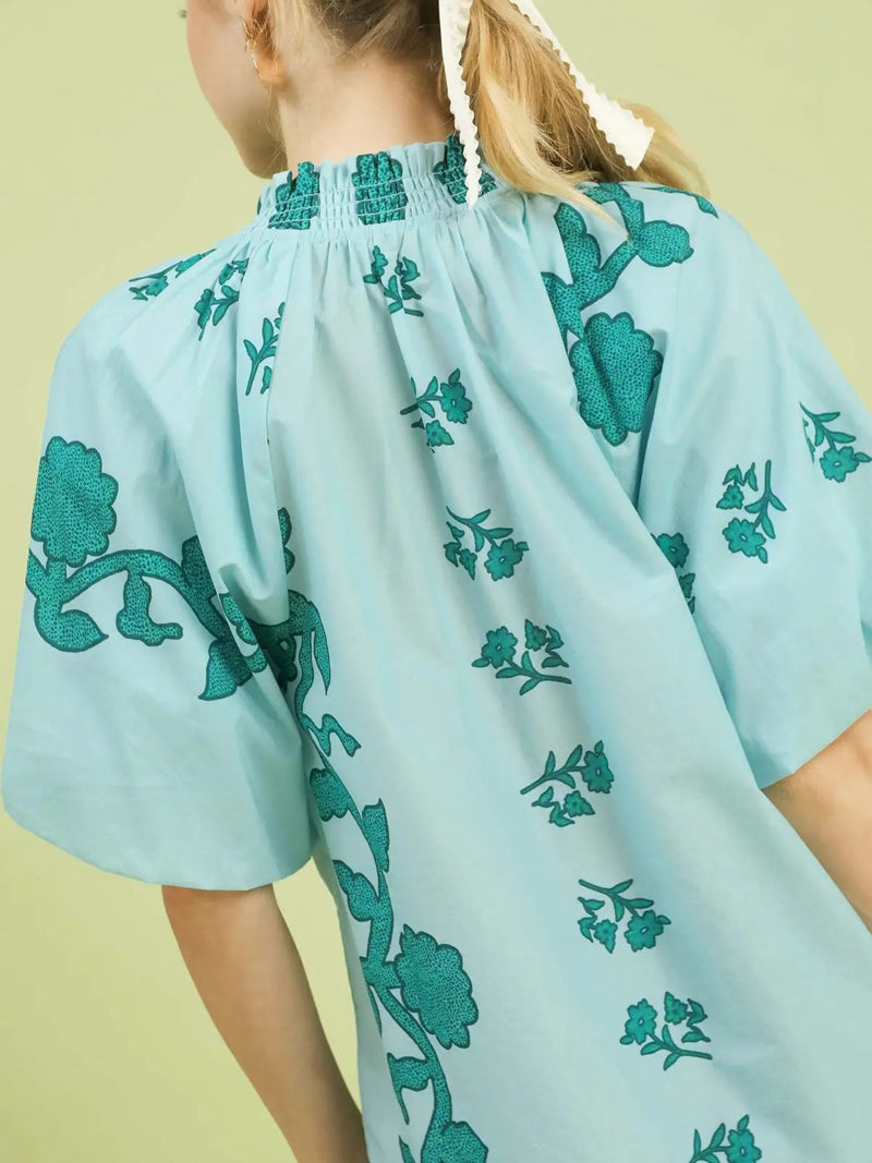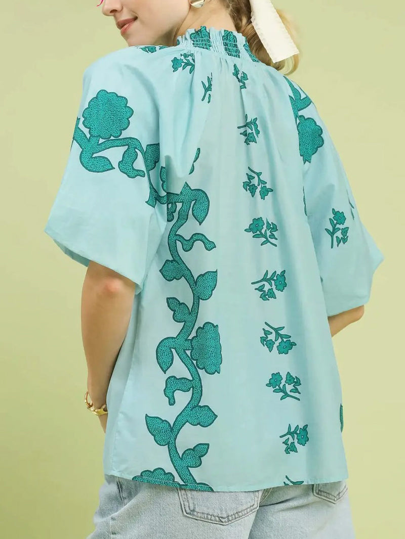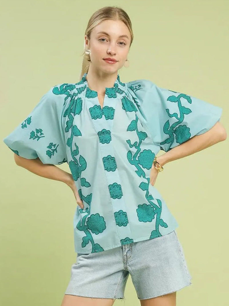 This fun teal floral blouse features a flattering split v-neckline with a smocked collar for a touch of texture. Short wide puff sleeves add soft volume, while the straight hem and relaxed silhouette keep it easy and breezy.