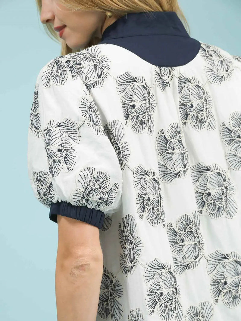 This off-white blouse is beautifully accented with deep blue embroidery for a look that feels both classic and fresh. The flattering split neckline and contrast band trim adds just the right pop, while short puff sleeves keep it sweet and playful.