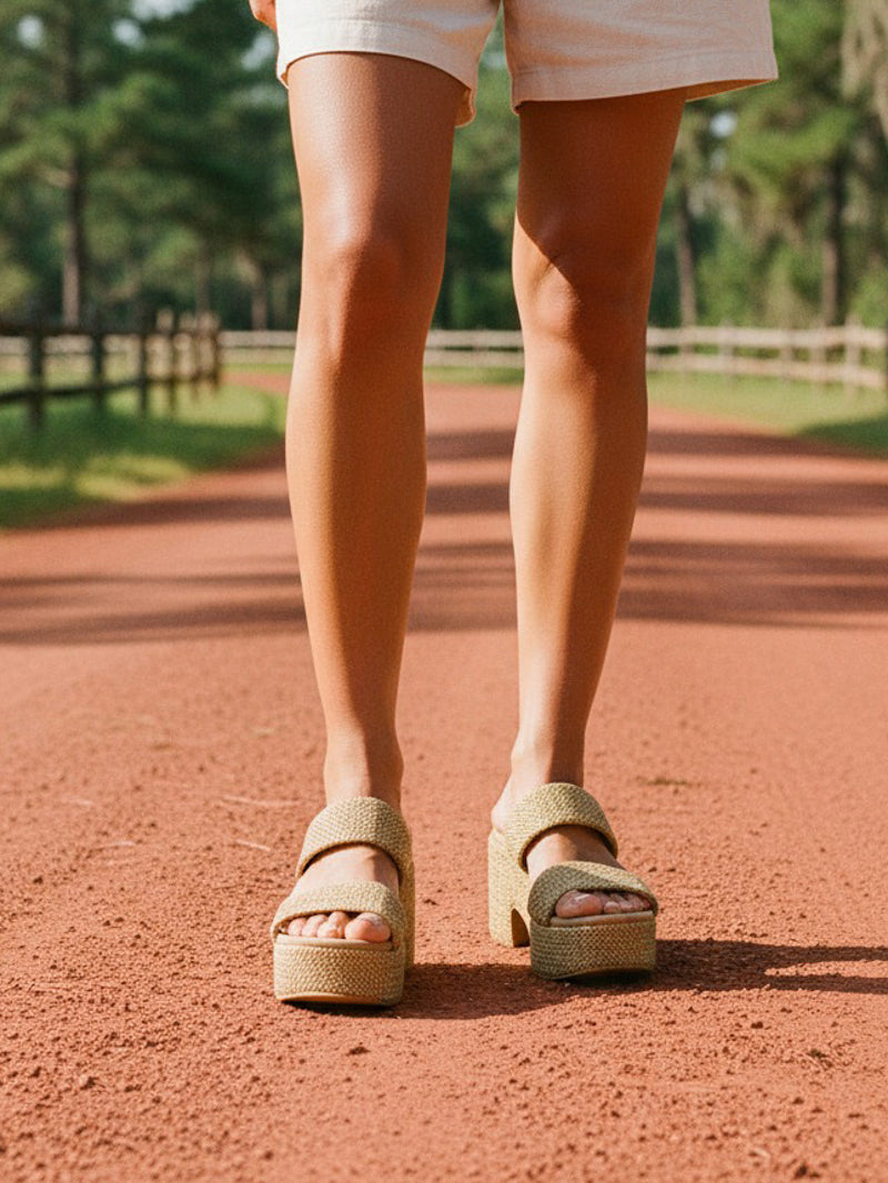 One of our favorite beachy platform sandals, featuring a beautifully woven texture, block heel and double-strap silhouette design, effortlessly bridging the gap between bohemia and modern city attitude.