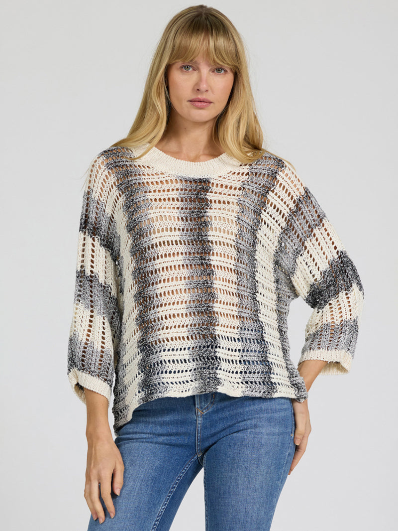 This gray open-knit sweater top features relaxed three-quarter dolman sleeves for an easy, laid-back feel. A classic crewneck gets a fresh pop of white contrast, adding just the right touch of polish.