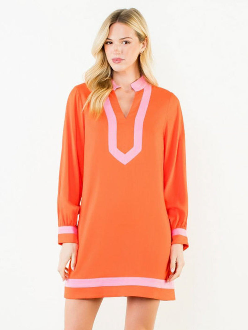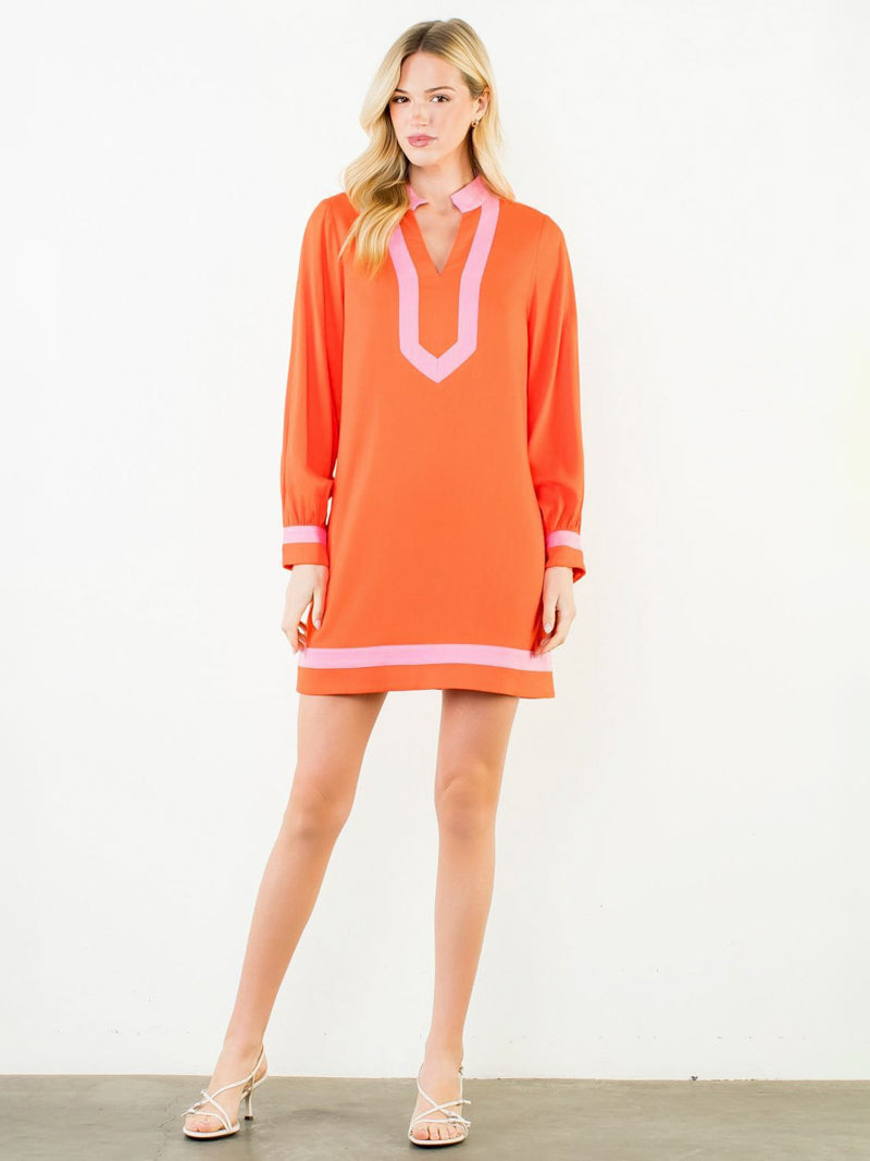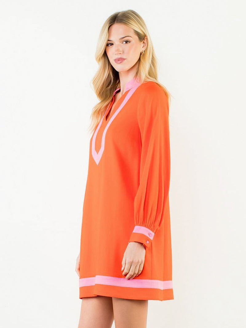 This vibrant orange mini dress with pink contrast bands is made to turn heads. A playful v-neck meets a chic pink mandarin collar, while long sleeves with buttoned cuffs add a polished twist. Bright, bold, and just a little mischievous.