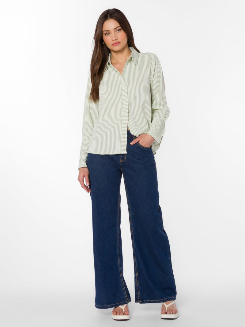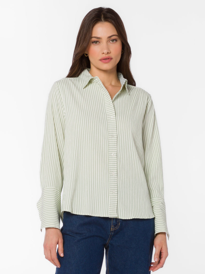 This sage green striped seersucker shirt is all about relaxed charm. The collared design and full button-front give it classic polish, while long sleeves with oversized button cuffs add a playful twist. Perfect for layering or wearing on its own with laid-back flair.