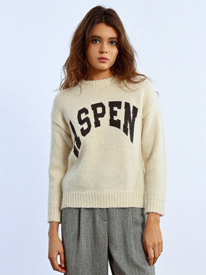Embrace winter warmth in this soft beige crewneck sweater, styled with classic ribbed edges for a snug, seasonal feel. The bold black Aspen lettering adds a chic, mountain-town vibe—perfect for fireside moments, snowy strolls, and all your cold-weather adventures.
