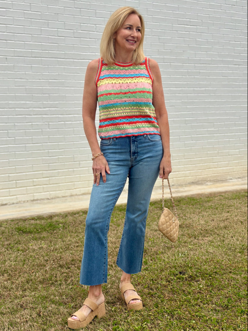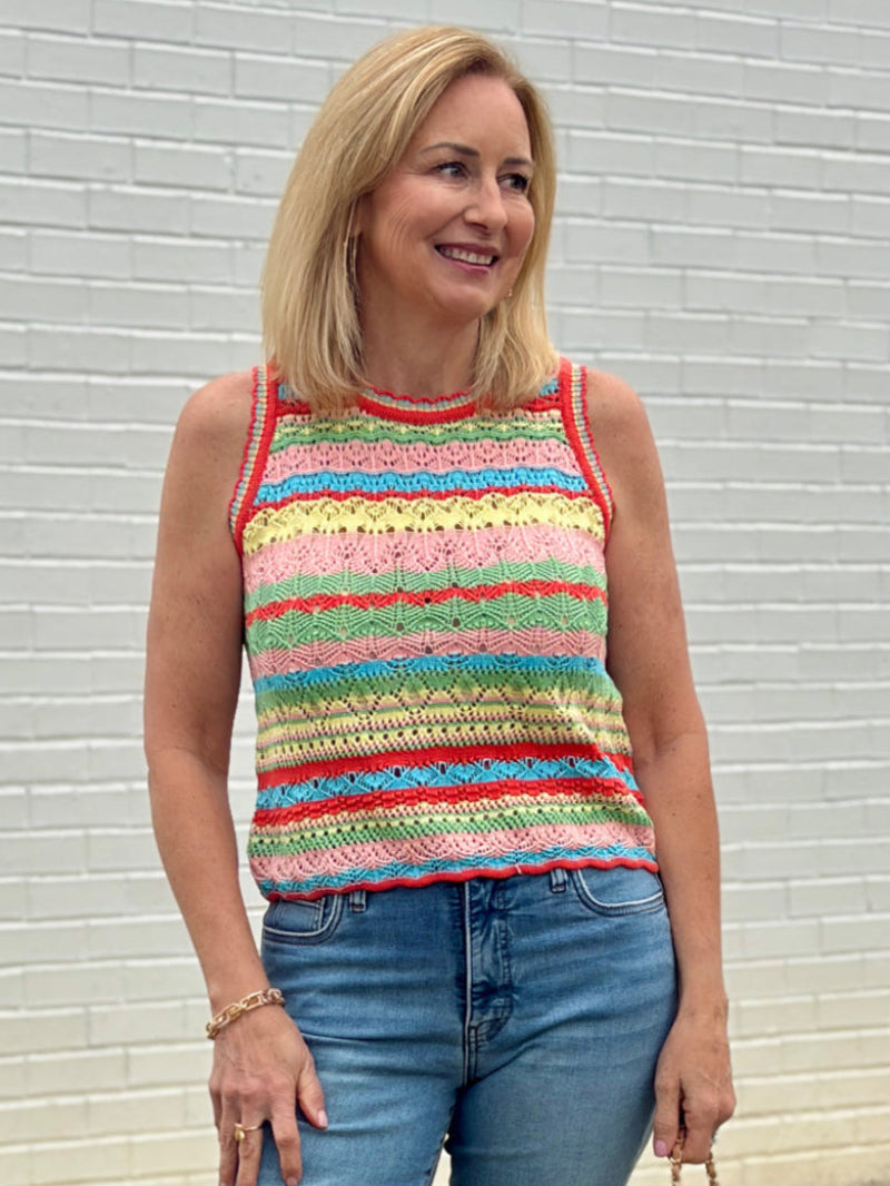 A little burst of color you’ll reach for on repeat! This fitted crochet tank features soft pointelle stripe yarn in vibrant multicolors, a classic crew neckline, and the sweetest scalloped edges for that extra touch of charm.