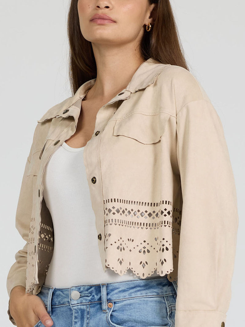 Soft and chic, this light bone faux suede jacket features delicate laser-cut motifs and a sweet scalloped hem for a unique finish. Designed in a cropped shirt-jacket silhouette with a collared neckline and button front, it’s the perfect lightweight layer.