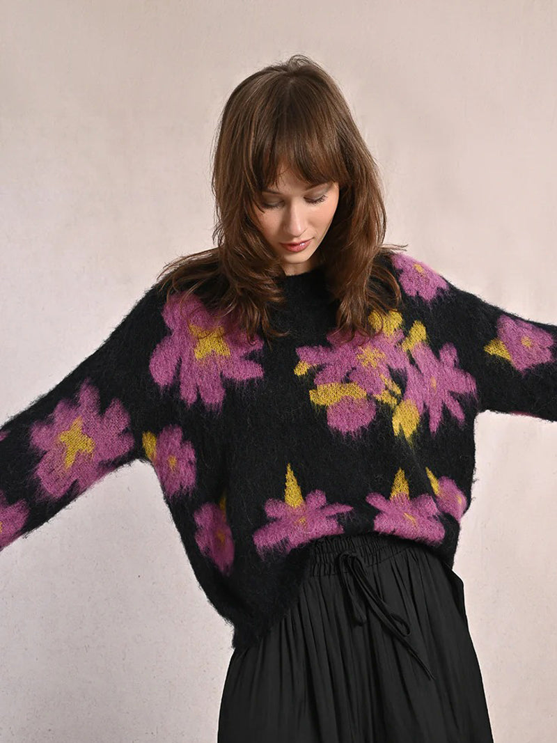 This oversized, black brushed-knit sweater brings all the cozy vibes with its soft fuzzy texture, purple flowers and long balloon sleeves. Straight fit, effortlessly cozy.