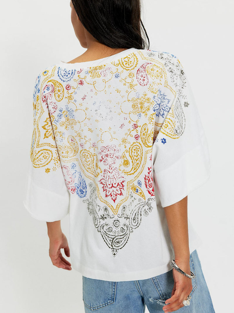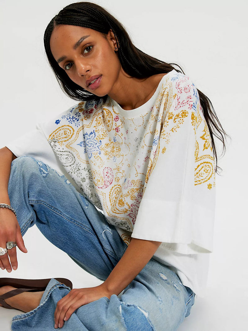 So soft and essential, this ivory cotton crewneck tee from We The Free features an oversized, drop-shoulder silhouette and a subtly distressed printed design for a style that is soon to be your go-to.