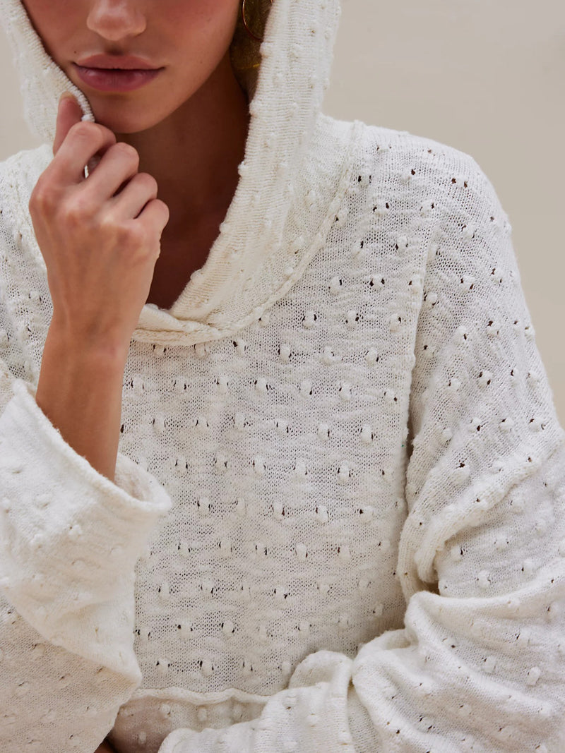 A soft cream-white pullover hoodie with a relaxed, easy drape, long dolman sleeves, and a front kangaroo pocket. Finished with eyelet-knit details and a cozy hood—this lightweight sweater is effortless, feminine, and made for everyday comfort.
