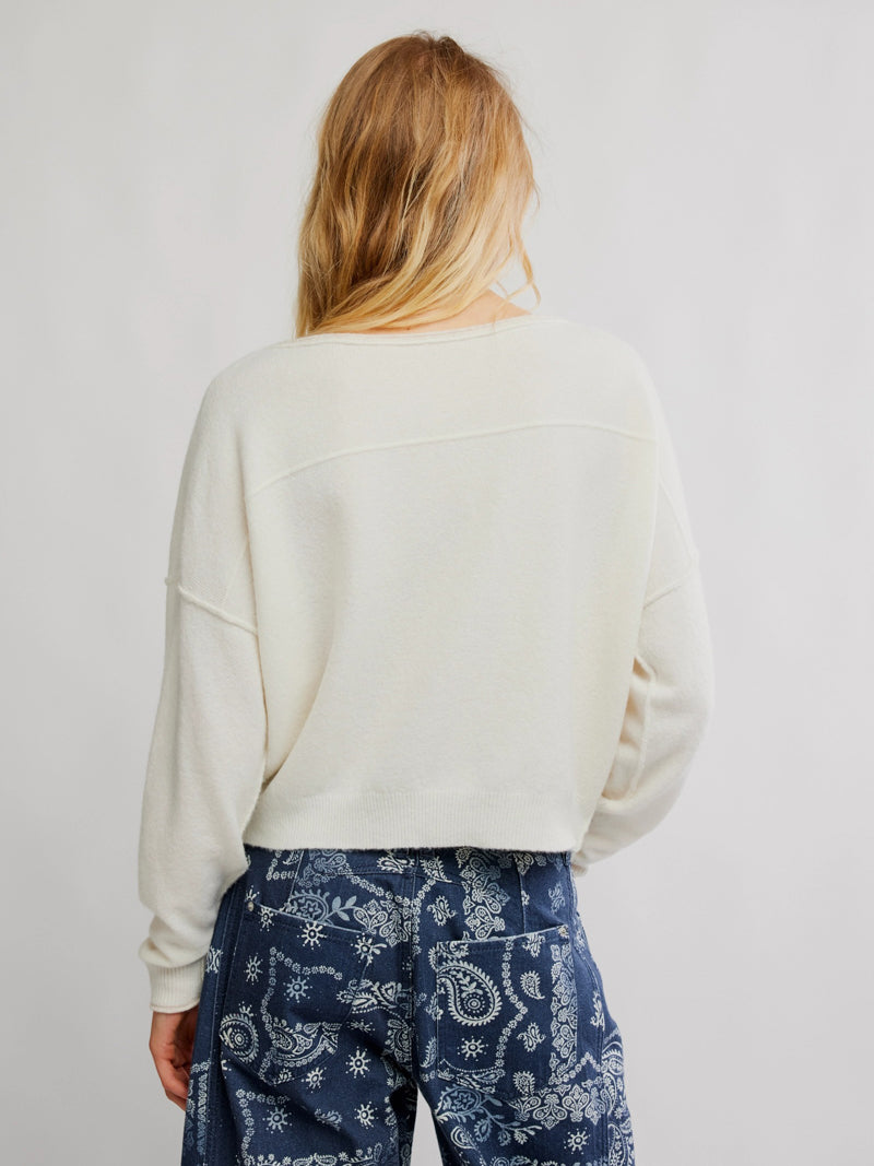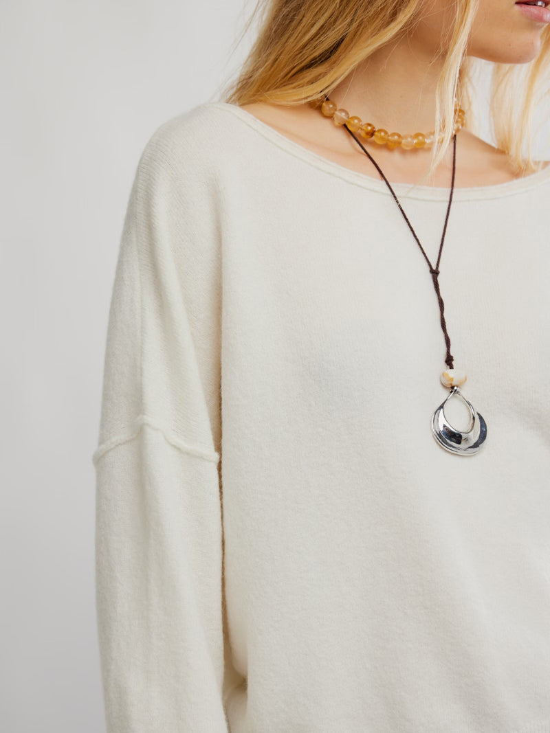 This dreamy soft, cream pullover sweater brings a modern, minimal vibe with its boat neck, long dolman sleeves, and relaxed, drop-shoulder silhouette. A luxe, cozy knit that pairs with almost everything.