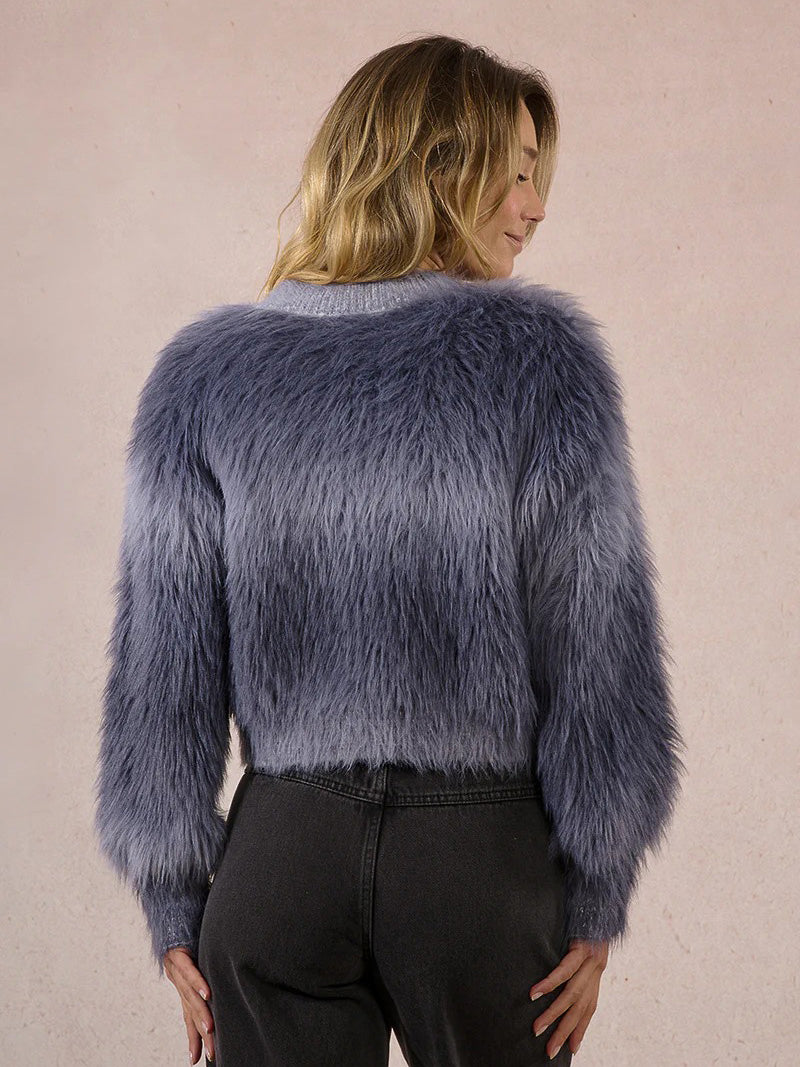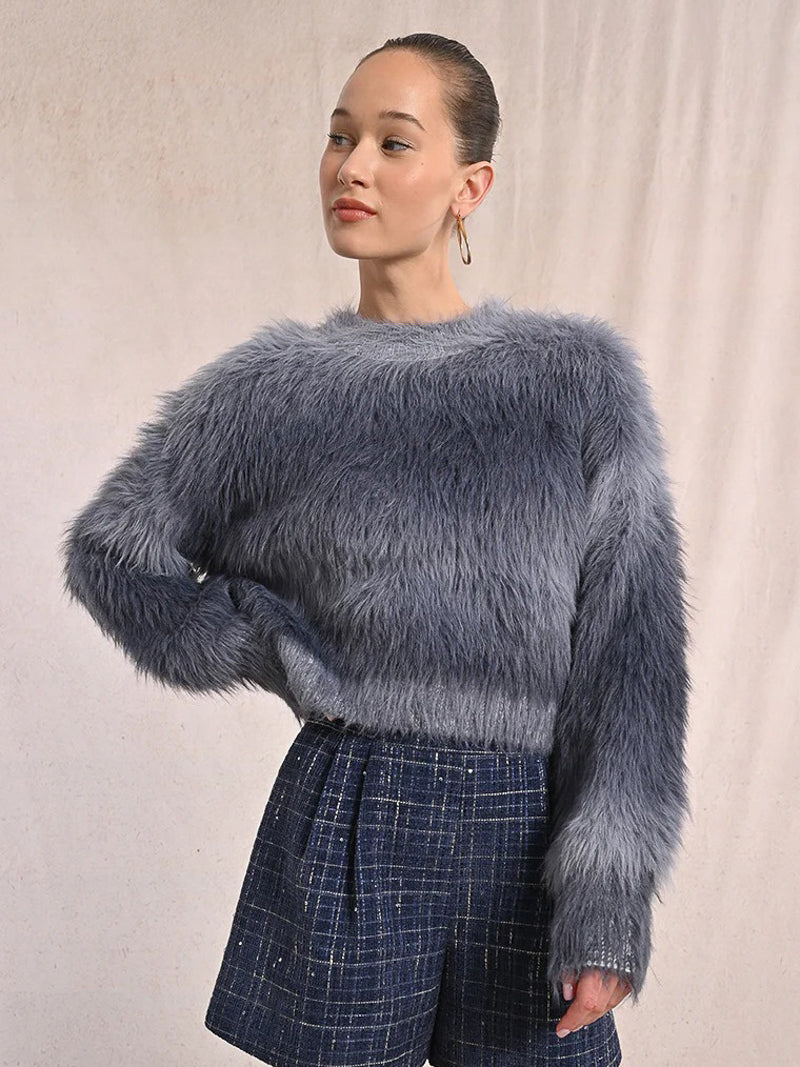 Elevate your casual looks with this fuzzy gray tie-dye style ombre sweater crafted in a soft, brushed knit. Its short, modern cut adds a fresh silhouette, perfectly balanced by long balloon sleeves finished with gently tightened cuffs for a touch of volume and structure.