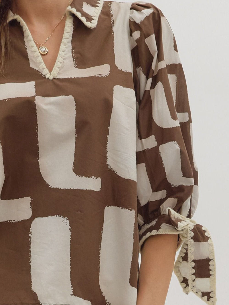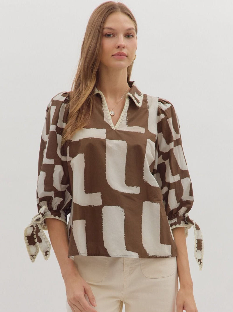 Mixing playful prints with chic details, this brown and white geo 3/4 puff sleeve top brings a flirty twist to your look. Featuring a split v-neck with collar, scalloped sleeve trims, and self-tie accents.