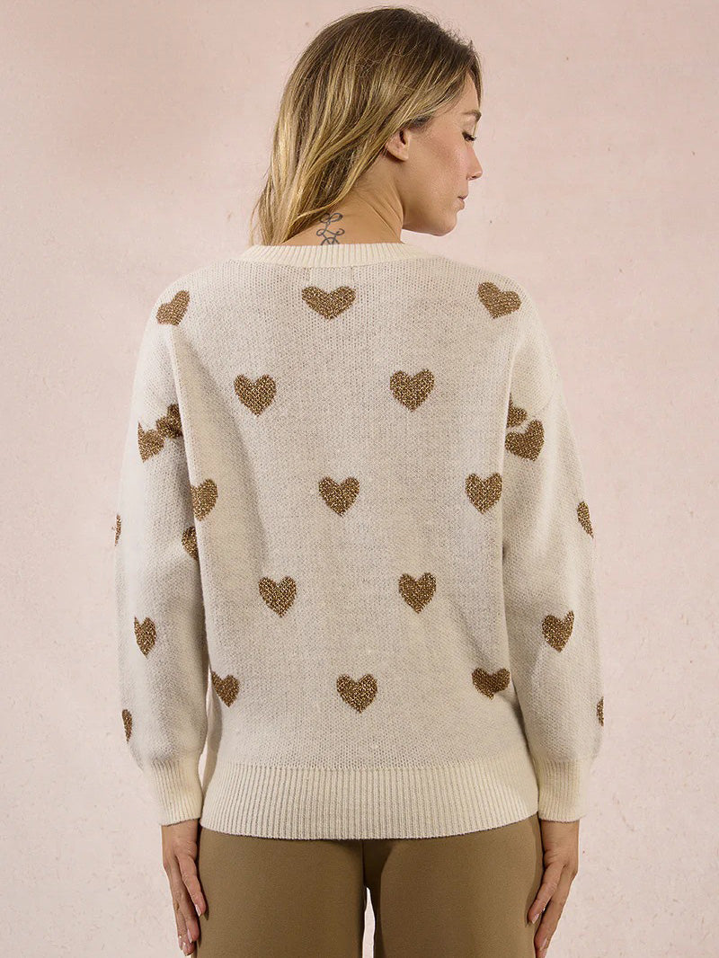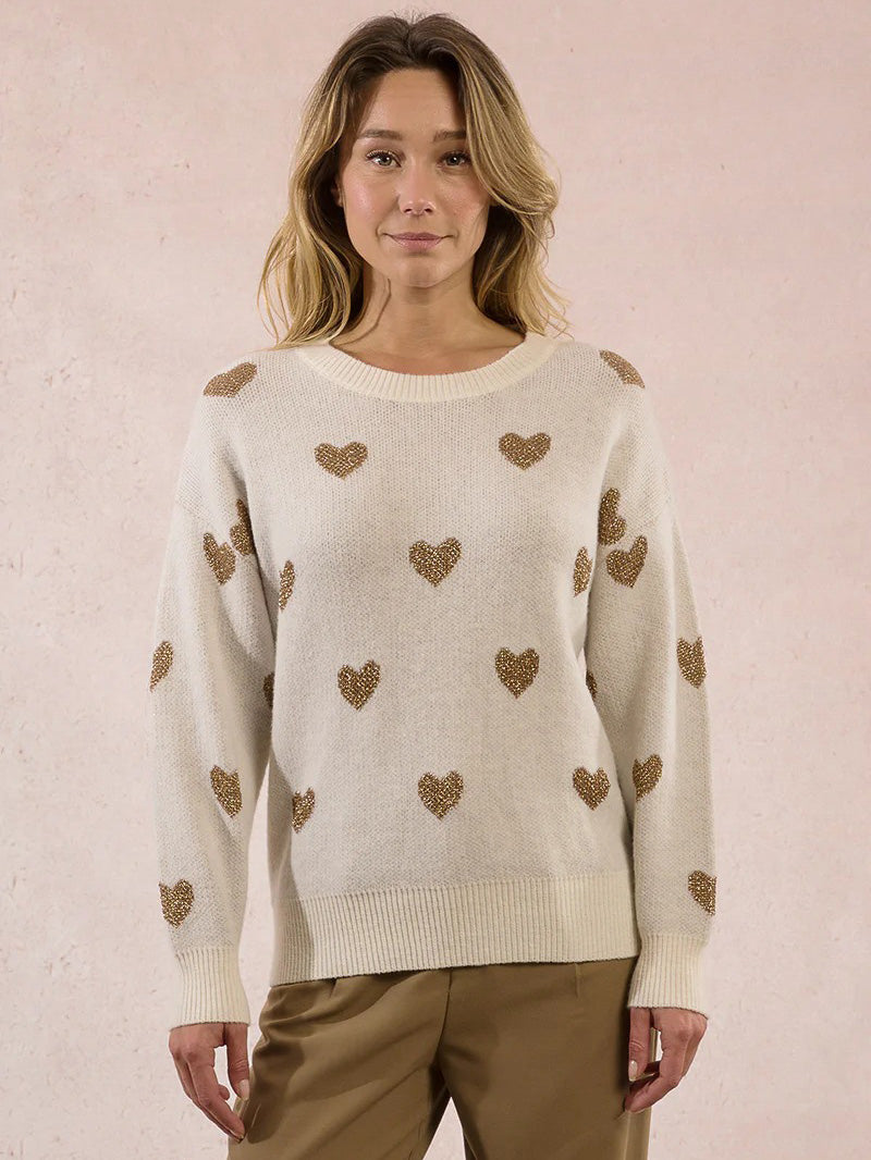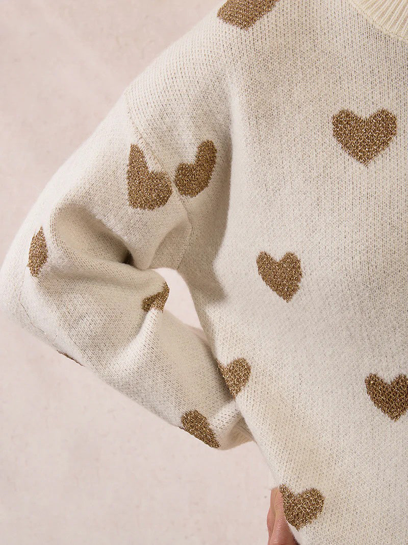 Fall for this beige cream knitted sweater adorned with glittery gold hearts for a touch of playful charm. Its straight fit, round neckline, and ribbed finishes keep it effortlessly cute and cozy—perfect for adding a hint of sparkle to your day.
