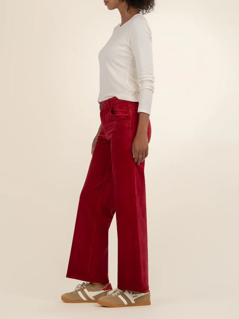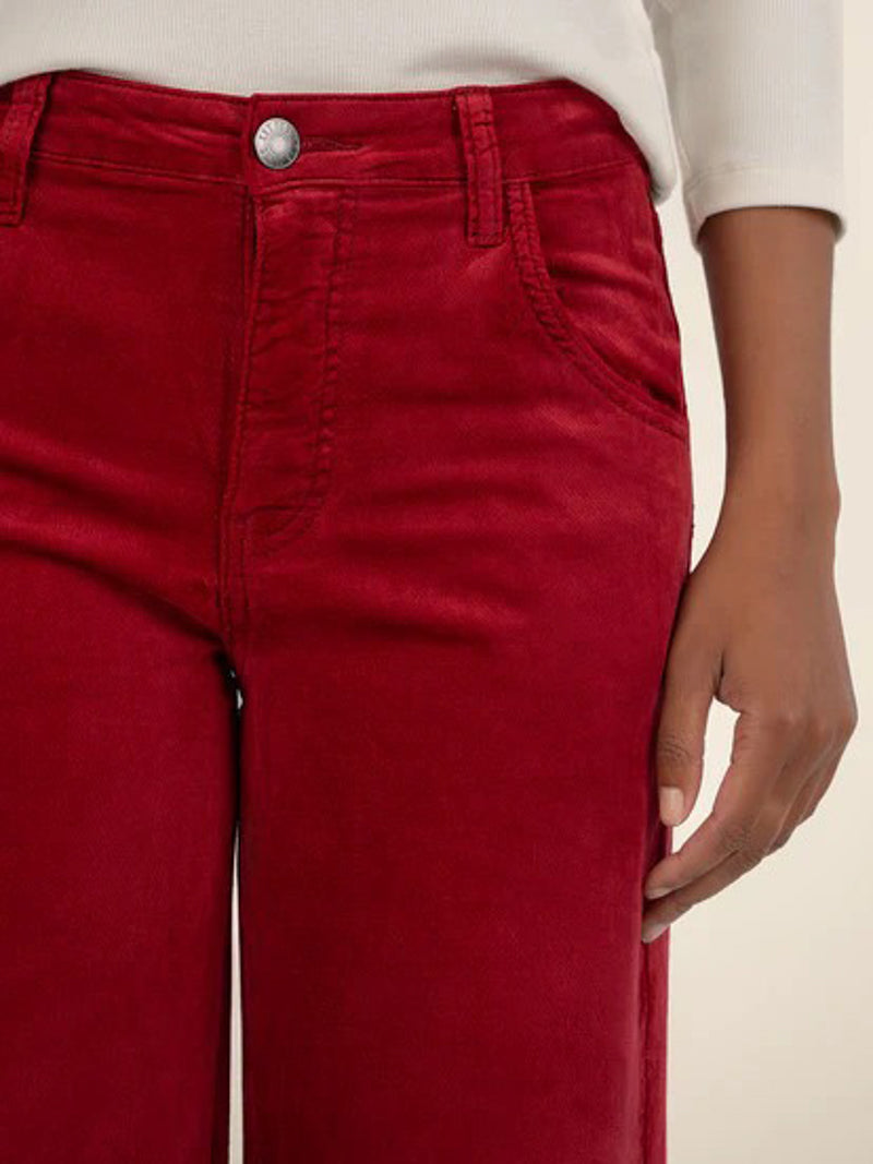 These are must-haves! Cherry red, these high-rise velveteen pants feature a wide straight leg with a hint of flare, striking the perfect balance between structure and flow. Denim jean cut, but made from soft, stretchy fabric — they deliver comfort, flattering style, and standout appeal in every step.