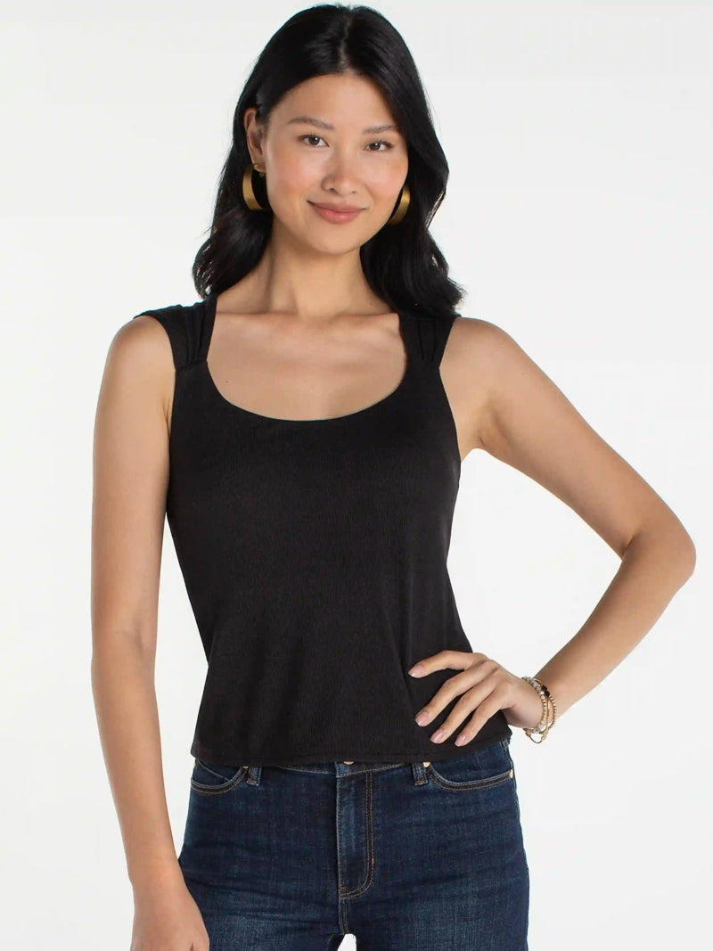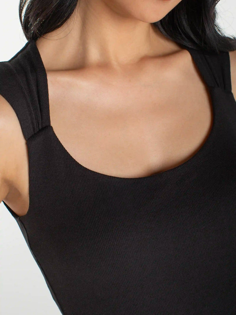 This chic, black sleeveless top gives you a streamlined silhouette thanks to double-layer mini rib knit and shirring detail. The built-in bra layer offers light support and coverage, so you get structure and comfort in one easy piece.