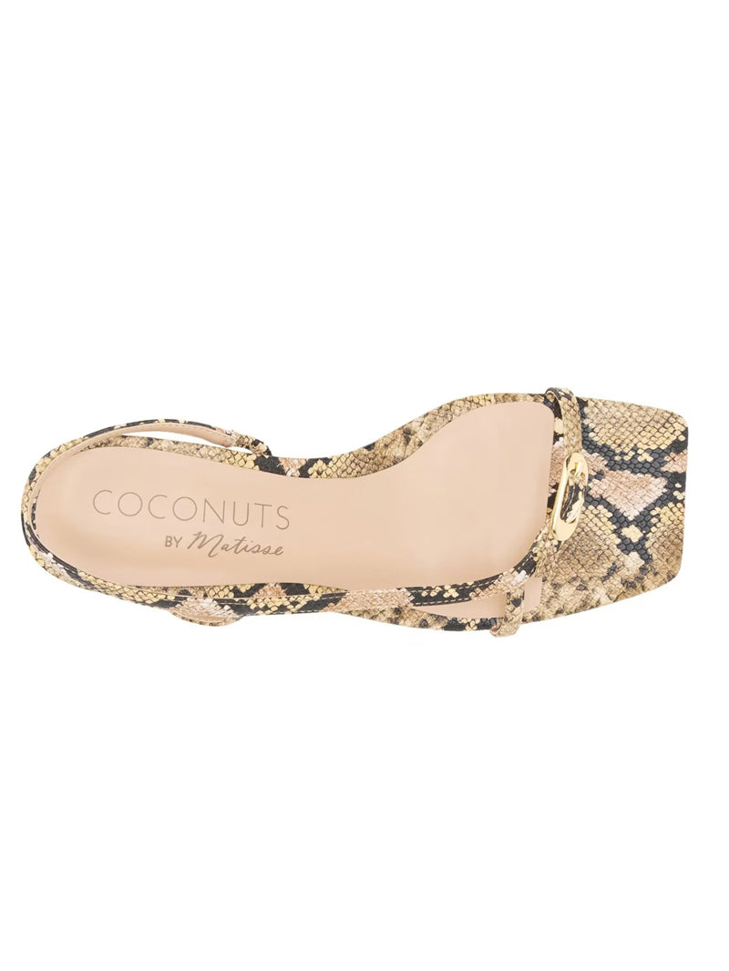 Bring a fresh take to your warm-weather rotation with this strappy snakeskin sandal, with its slip-on silhouette, ankle strap and square open toe. The kitten heel and vamp strap with and gold buckle add a subtle edge, making it a versatile choice that transitions effortlessly from casual days to dressy outings.