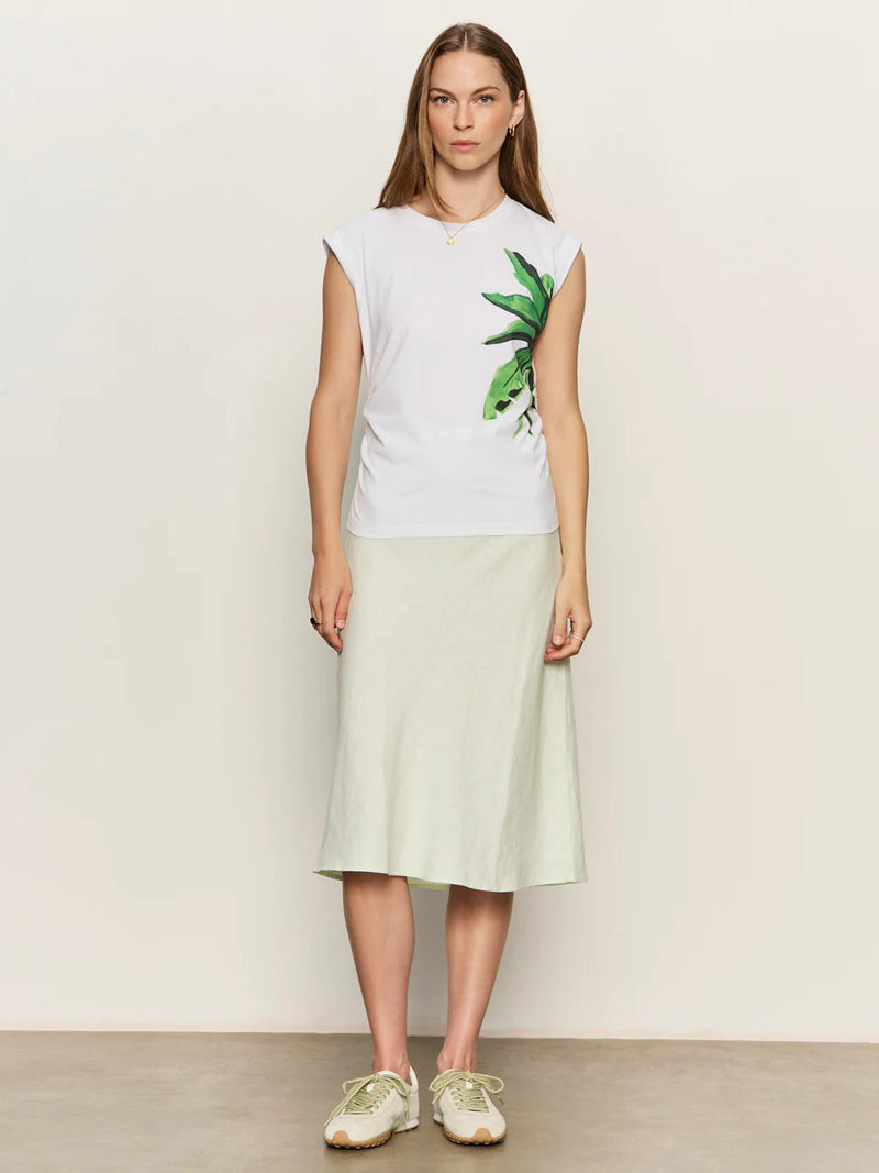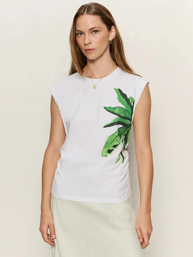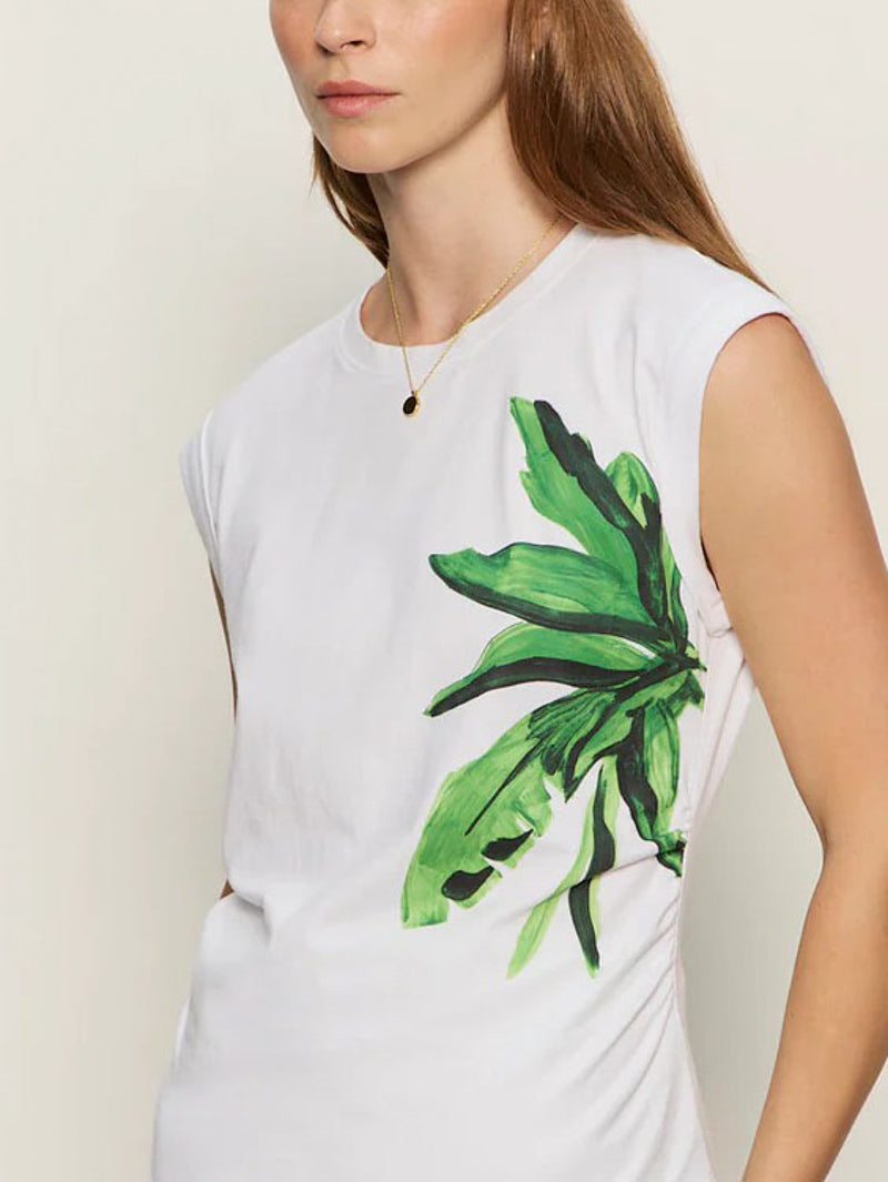 Effortlessly cool with an artsy edge. This palmetta muscle tank brings a relaxed vibe with its classic crew neck and rolled cuff sleeves. The subtle waist ruching adds a flattering, feminine twist to the laid-back silhouette.