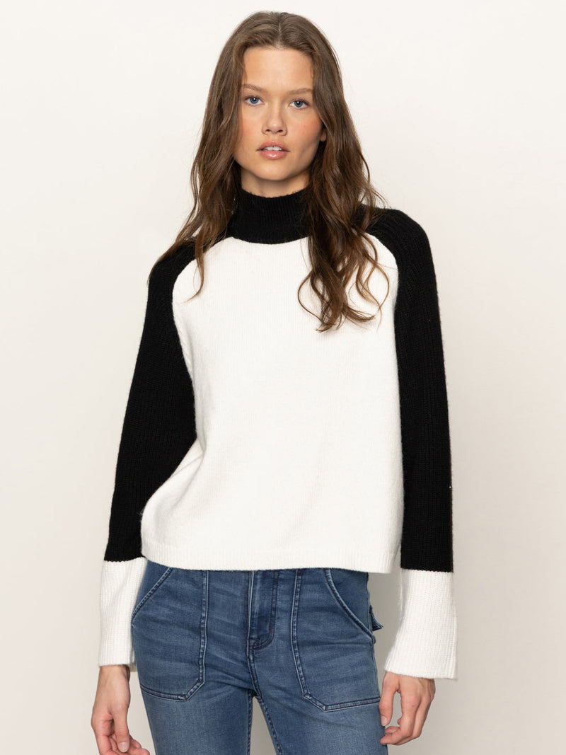 Stay cozy and cool in this two-toned black and white mock neck sweater. With fuzzy softness, relaxed fit, and sporty raglan sleeves, it’s equal parts comfy and chic. Ribbed cuffs and a subtle back neck slit add that touch of detail that takes it from basic to standout.
