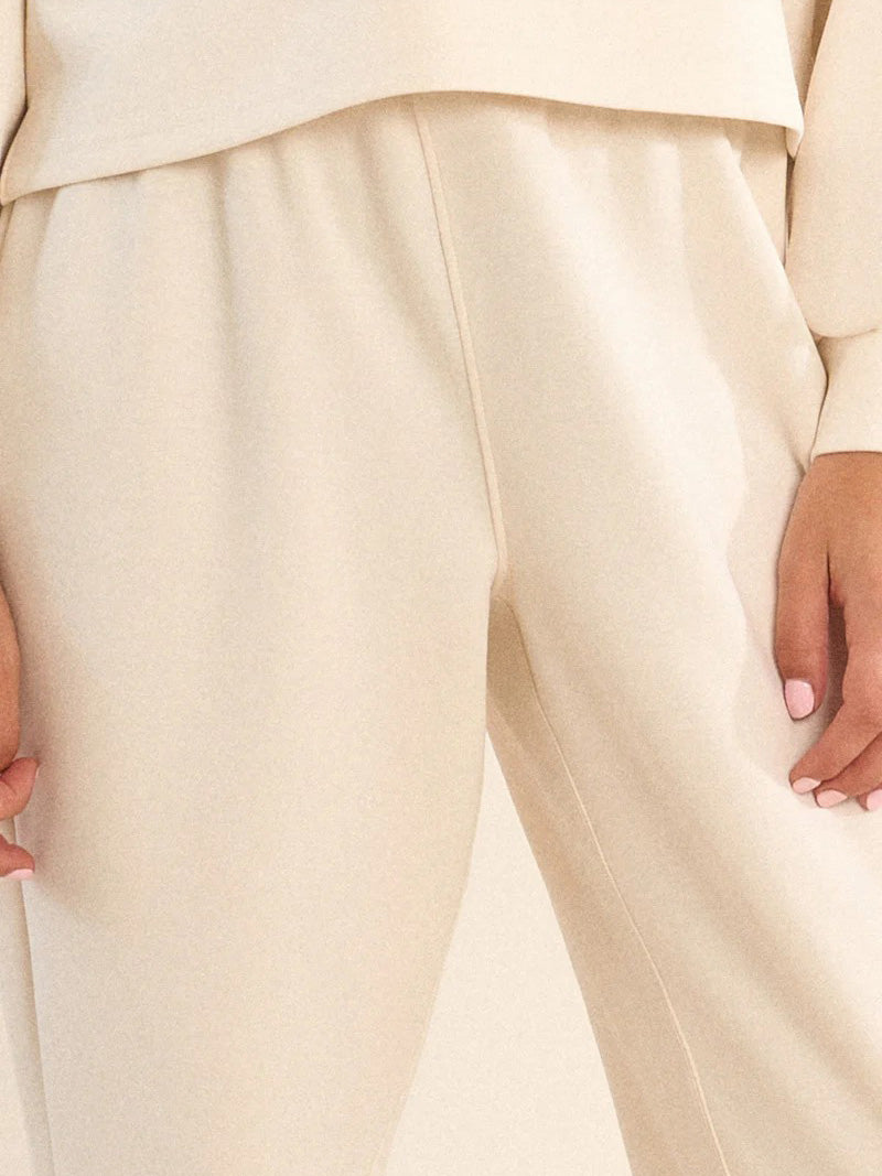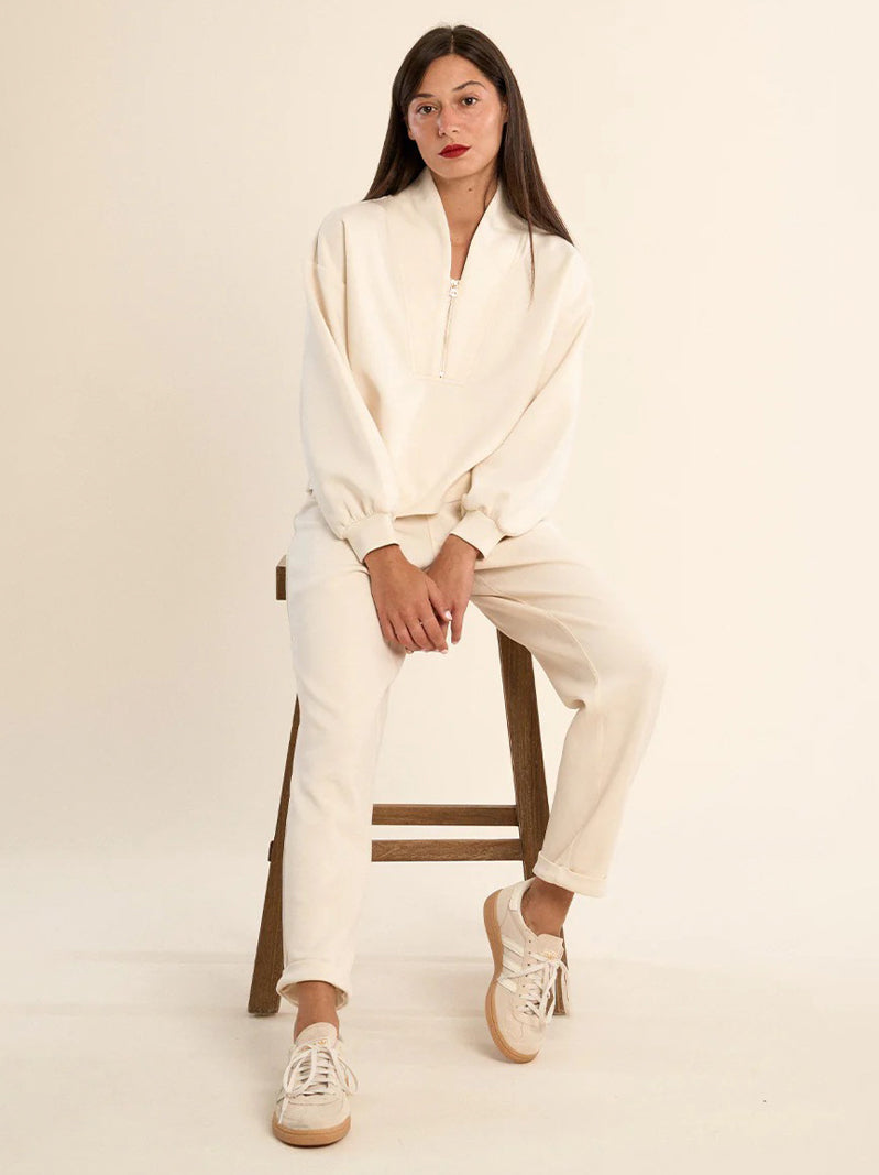 These soft, breathable ivory cream sweatpants are built for comfort with a flexible elastic waistband for an easy fit. The relaxed shape and rolled hem add a laid-back, cozy feel—perfect for everyday wear or lounge. Pair with matching half zip sweatshirt to wear as a two-piece set.