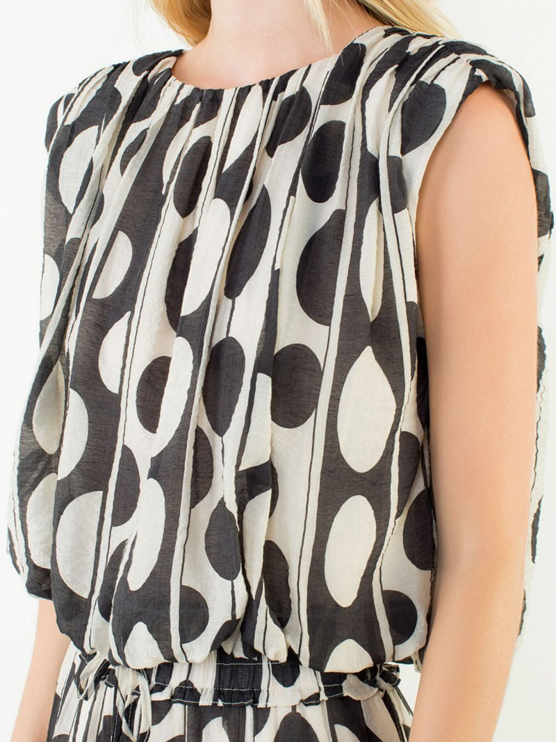 This bold sleeveless blouse features an abstract black-and-white geometric pattern that makes a statement without trying too hard. Designed with a classic crew neck, balloon hem silhouette, and a relaxed fit with subtle cinching—it’s the perfect mix of easygoing and eye-catching.