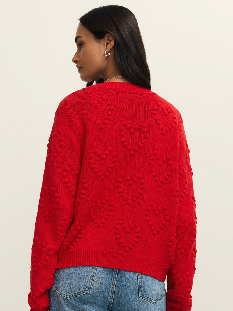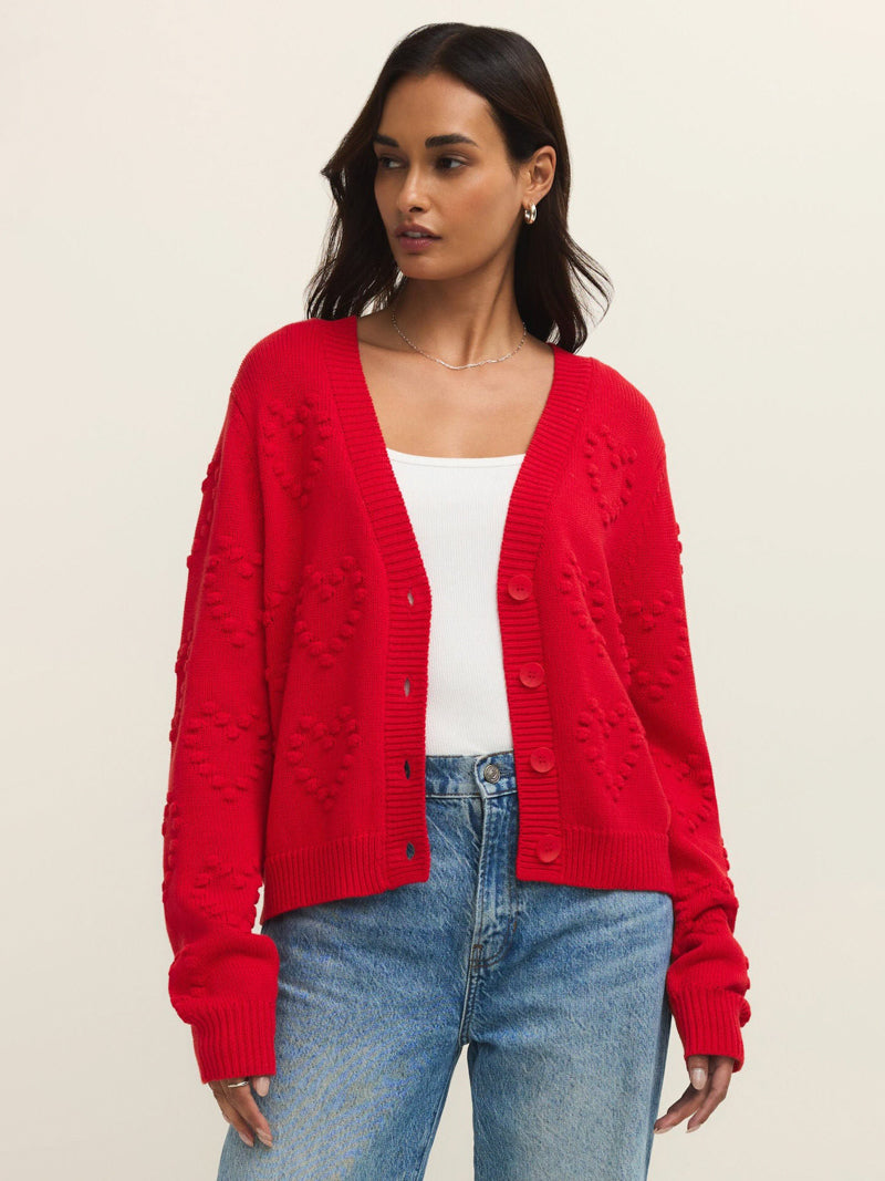 Wrap yourself in effortless warmth with this red knit cardigan, designed for both comfort and charm. Featuring a classic button-front closure and ribbed cuffs, hem, and neckline, it offers a flattering, easy-to-layer fit. A delicate embroidered heart pattern is woven throughout the soft fabric, adding a subtle yet playful detail.