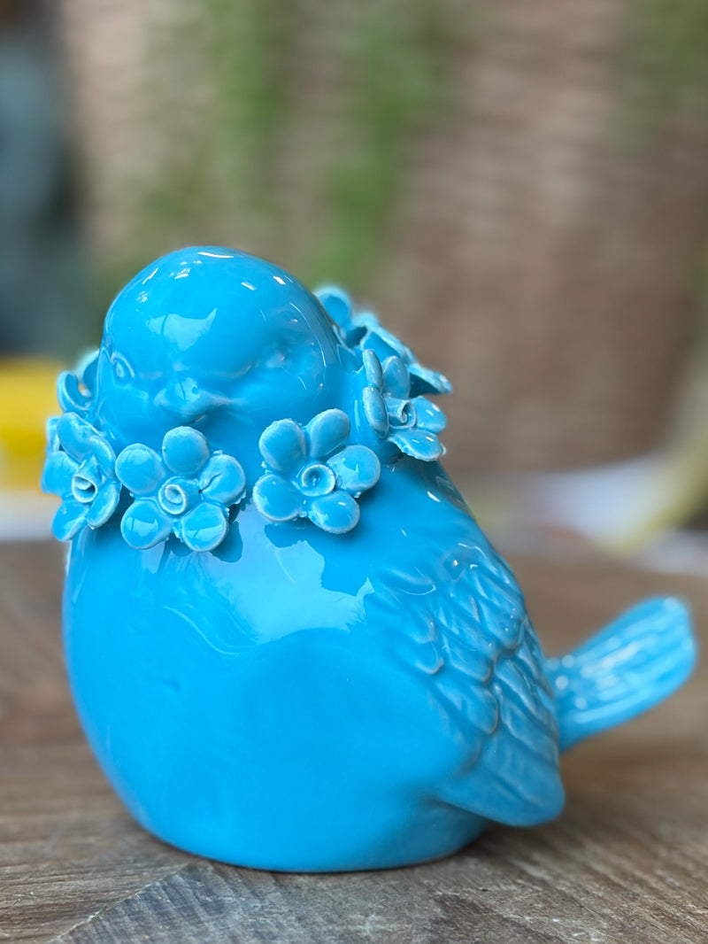 This ceramic blue bird decor is beautifully detailed with delicate floral accents, giving it a sweet, whimsical personality. The bright pop of color and gentle curves make it a lovely accent for shelves, windowsills, or tabletops.