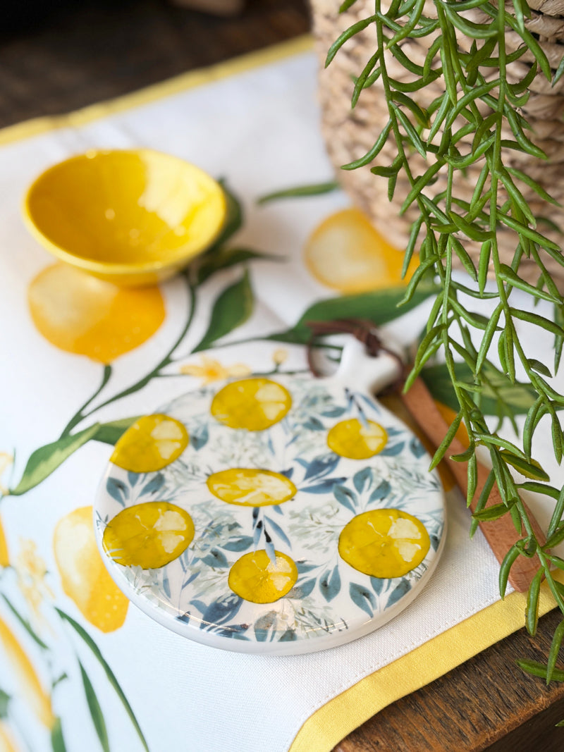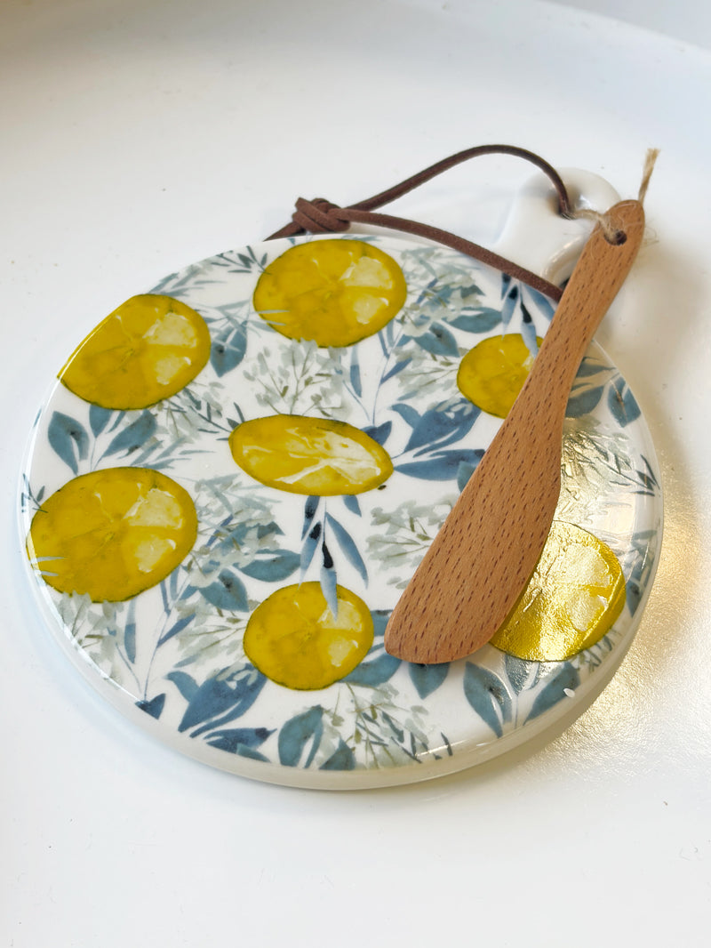 This mini ceramic serving board set features a bright lemon pattern that brings instant cheer to any spread, paired with a sweet wooden knife for easy serving. Perfect for cheeses, snacks, or little treats.