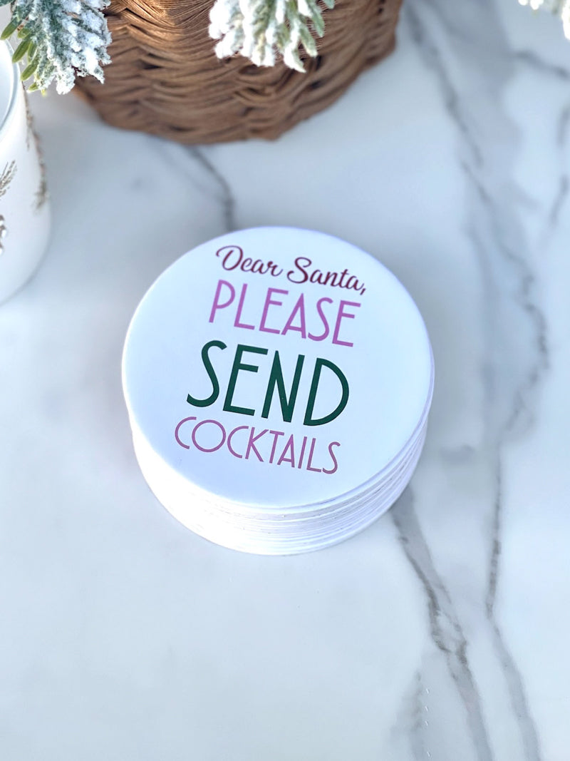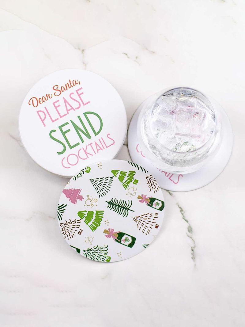 Add a dash of holiday cheer with these white, pink and green reversible coasters! One side features colorful Christmas trees, while the other says, 'Dear Santa, please send cocktails'. Flip them to match your mood and keep your drinks festive all season long!