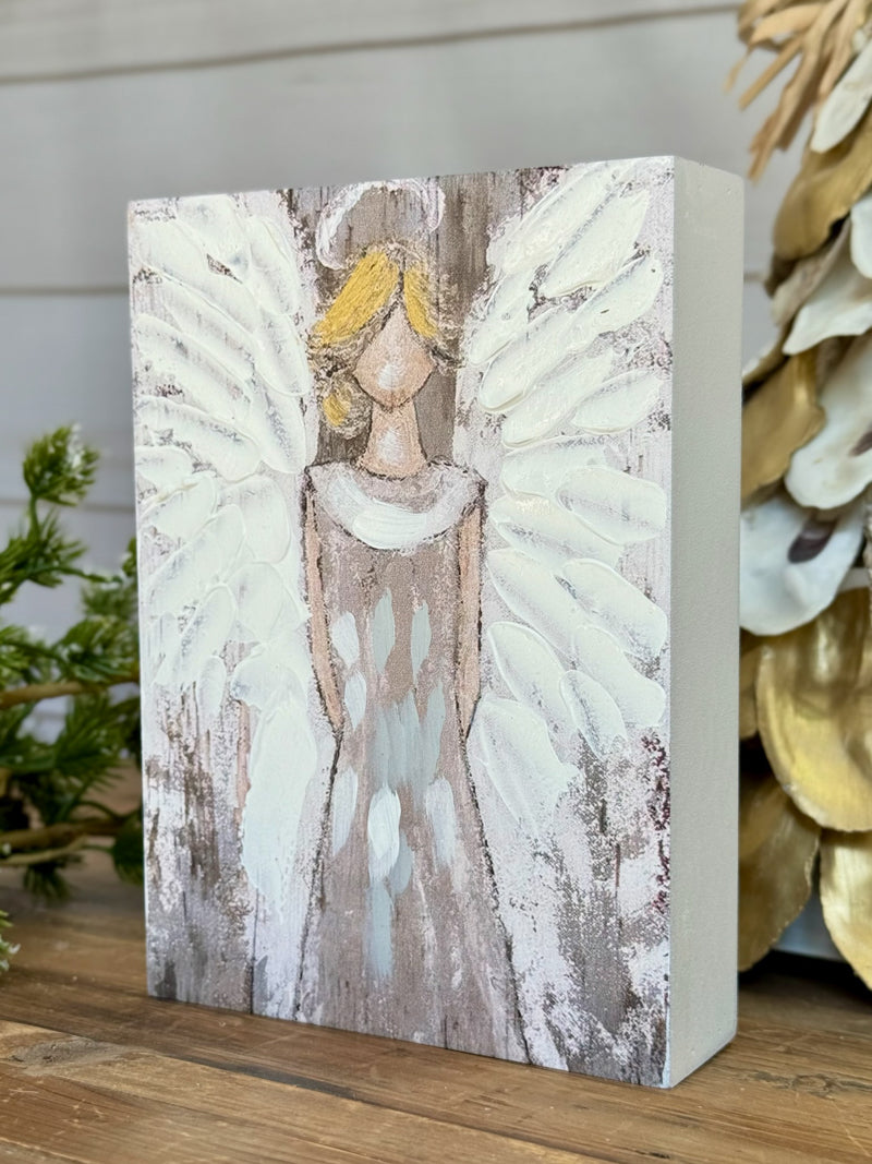 Celebrate the season with this charming hand-painted angel, crafted on a wooden block and adorned with delicate finger-painted wings. Full of warmth and whimsical detail, it brings a heartfelt, handmade touch to your holiday décor.
