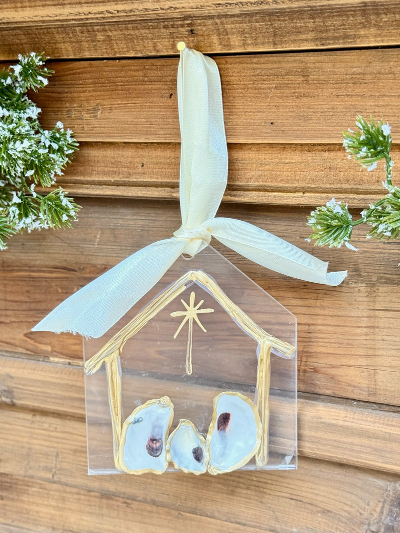 This delicate clear glass ornament captures the wonder of the nativity in shining gold, paired with sweet oyster shell details that give it a breezy beach-town feel. Finished with a soft gold ribbon, it’s a charming keepsake for anyone who loves coastal Christmas magic.
