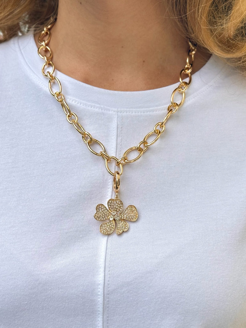 A little sparkle goes a long way—this shiny gold flower charm, dotted with twinkling rhinestones, is the spunky way to bloom on any necklace or scarf.
