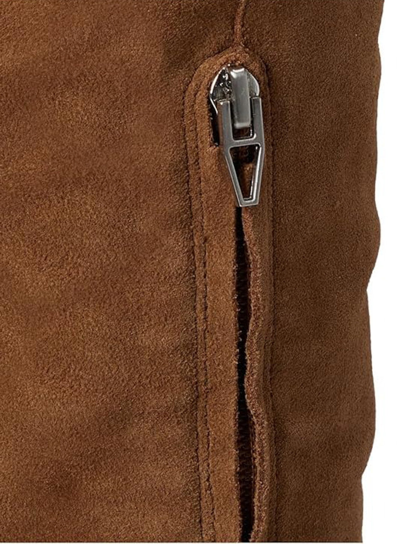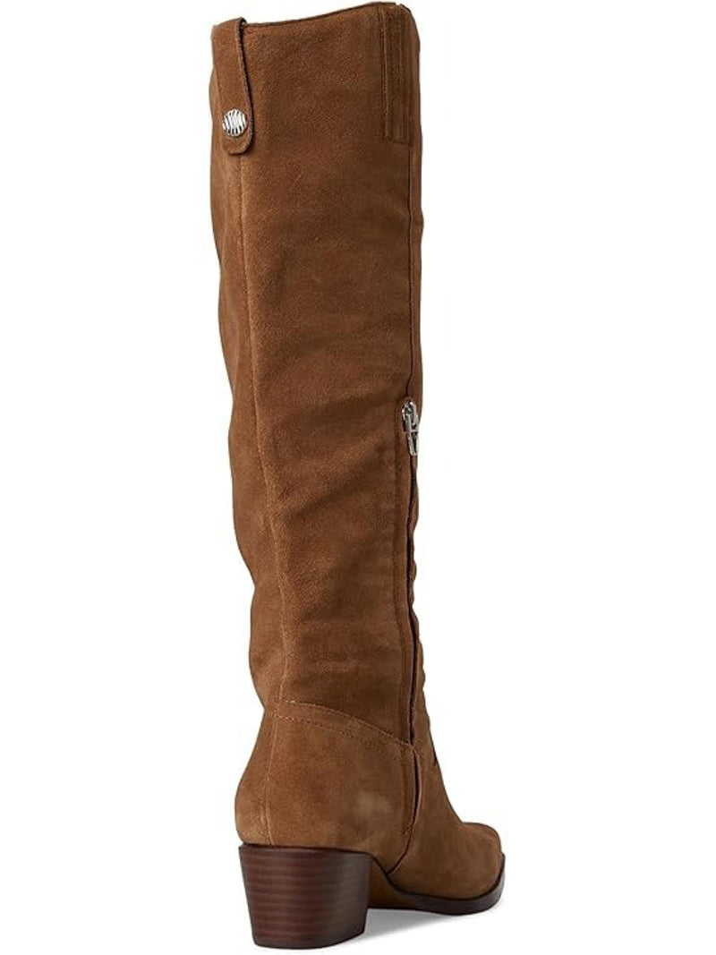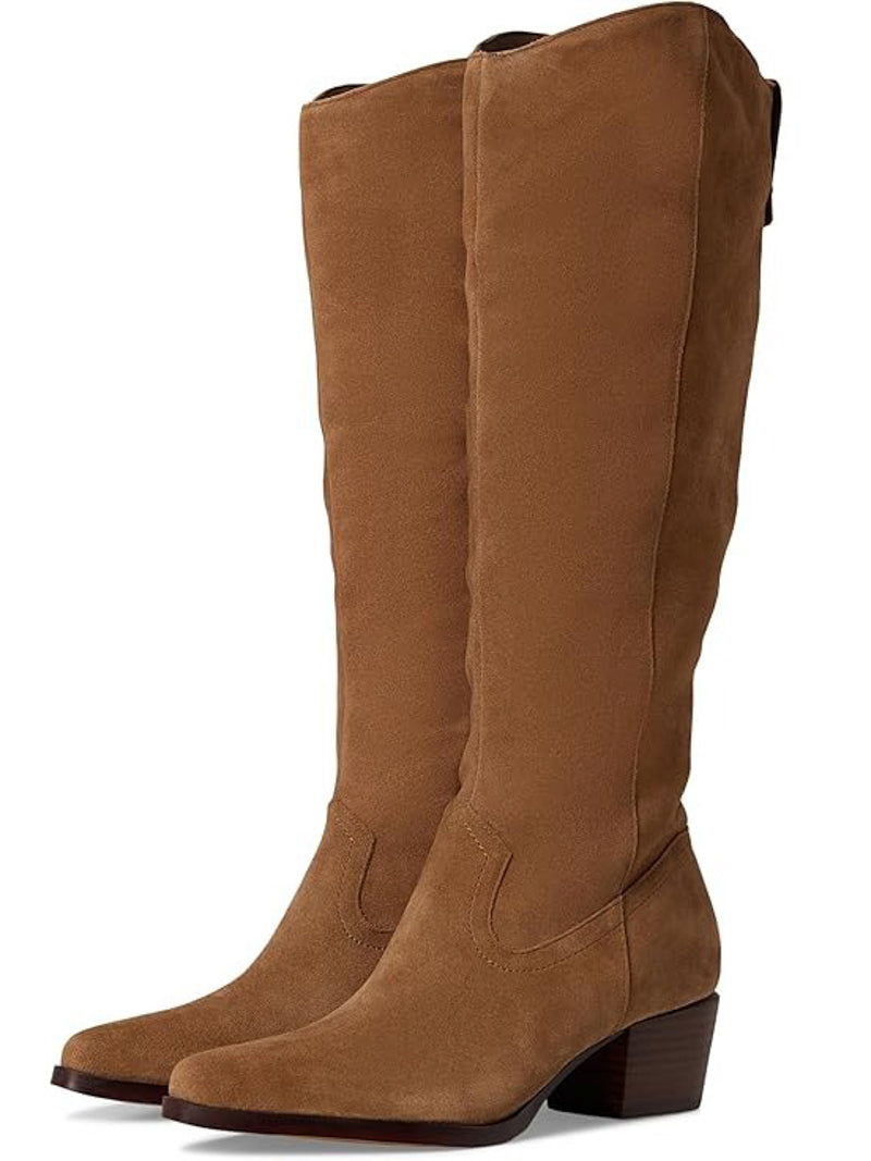 The Dolce Vita Virona H2O is a tall, pointed toe boot crafted in water-resistant brown suede, with stacked block heel and a curved top shaft for a flattering knee-high silhouette. A simple side zipper makes it comfortable and easy to slip off when the night is over.