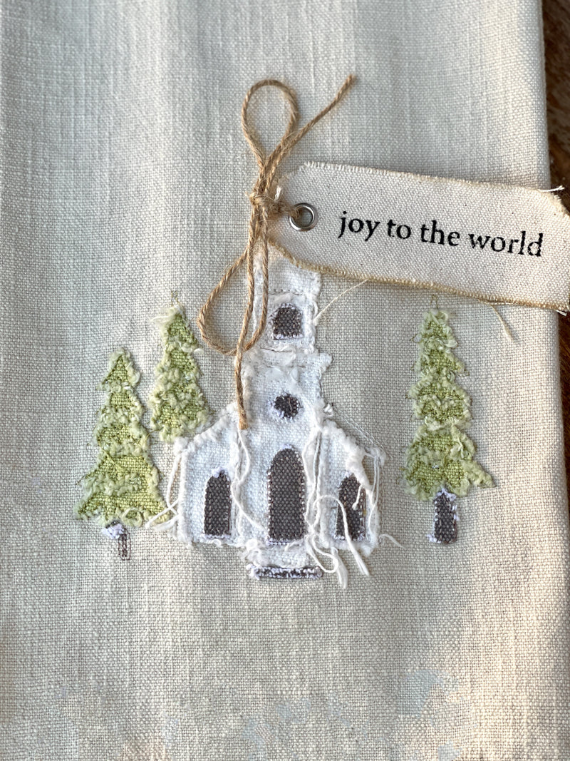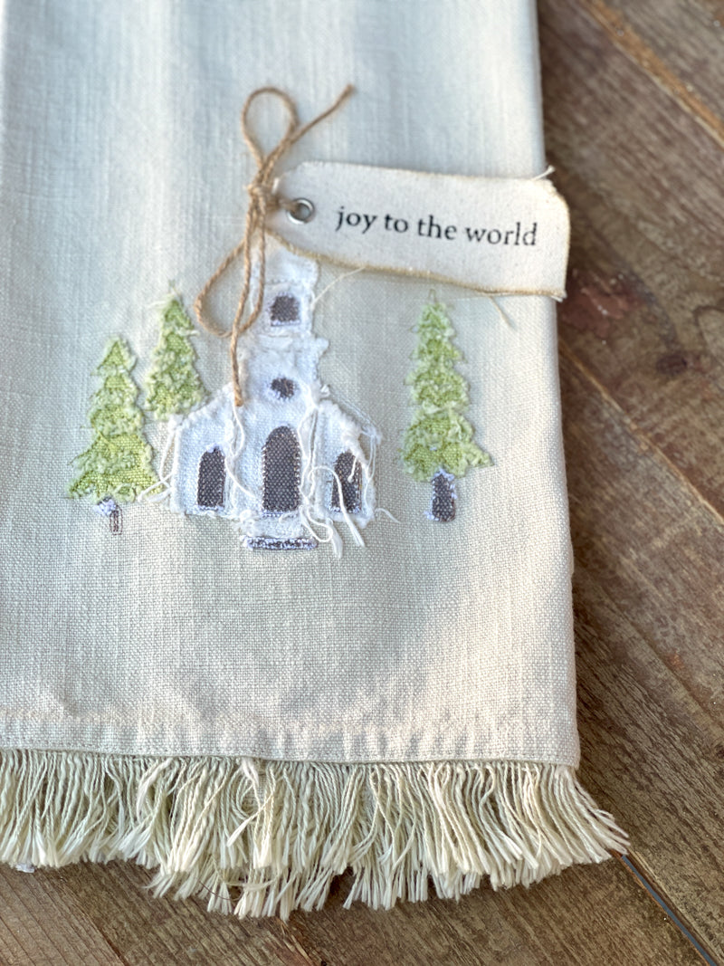 Spread holiday joy in your kitchen with this set of two identical, natural tea towels! Featuring frayed edges and delightful stitching of a church and trees, they are a reminder of faith and community, with a "Joy To The World" tag to add a festive touch. Perfect for gift-giving and hosting this season!