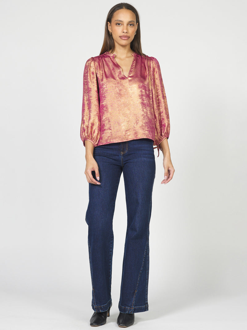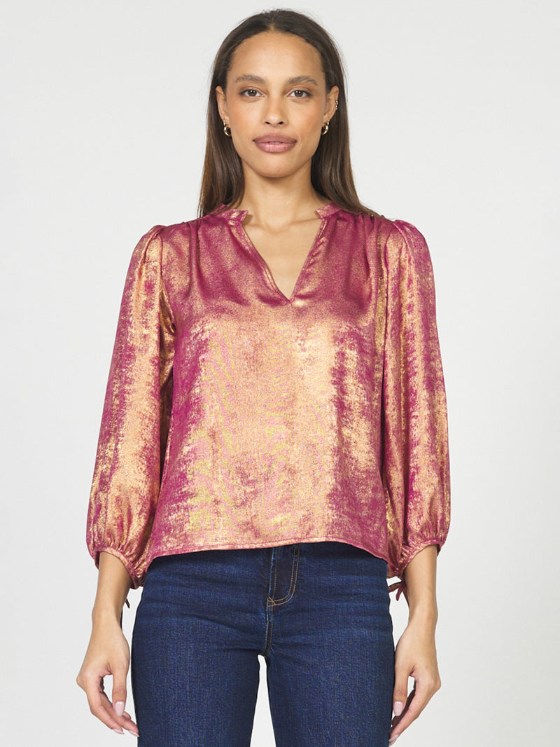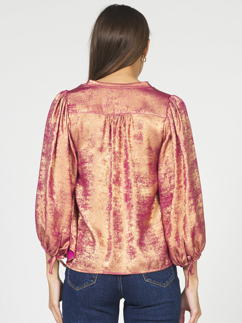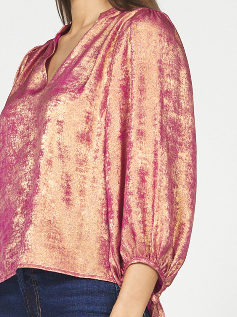 A touch of shimmer, a hint of glamour — this gold and fuschia pink blouse catches the light with every move. The metallic lamé fabric and three-quarter self-tie sleeves create a relaxed yet radiant silhouette, made for festive nights and sparkling moments.