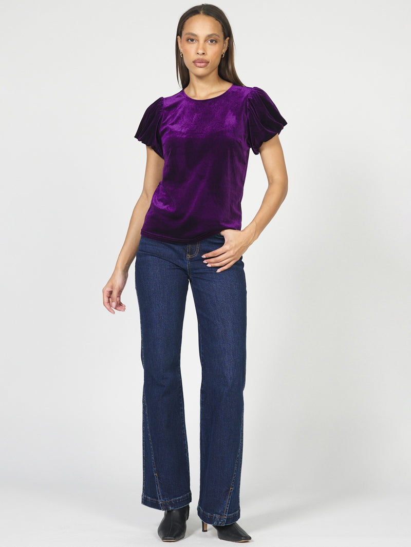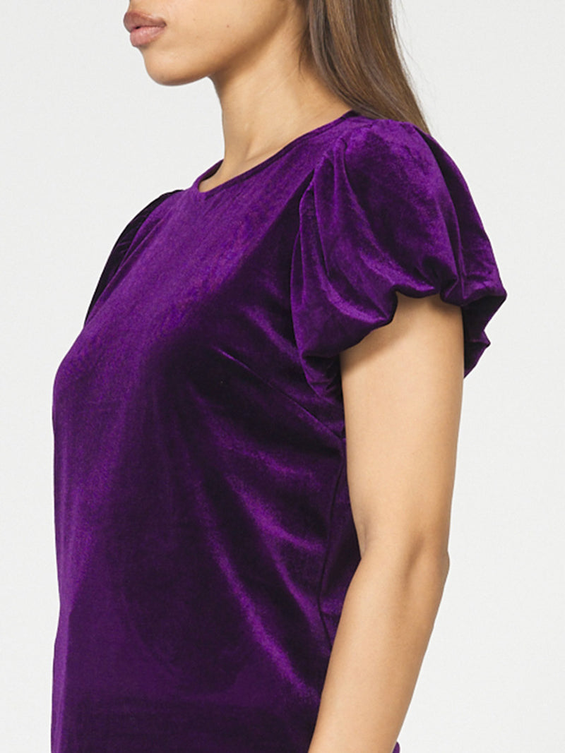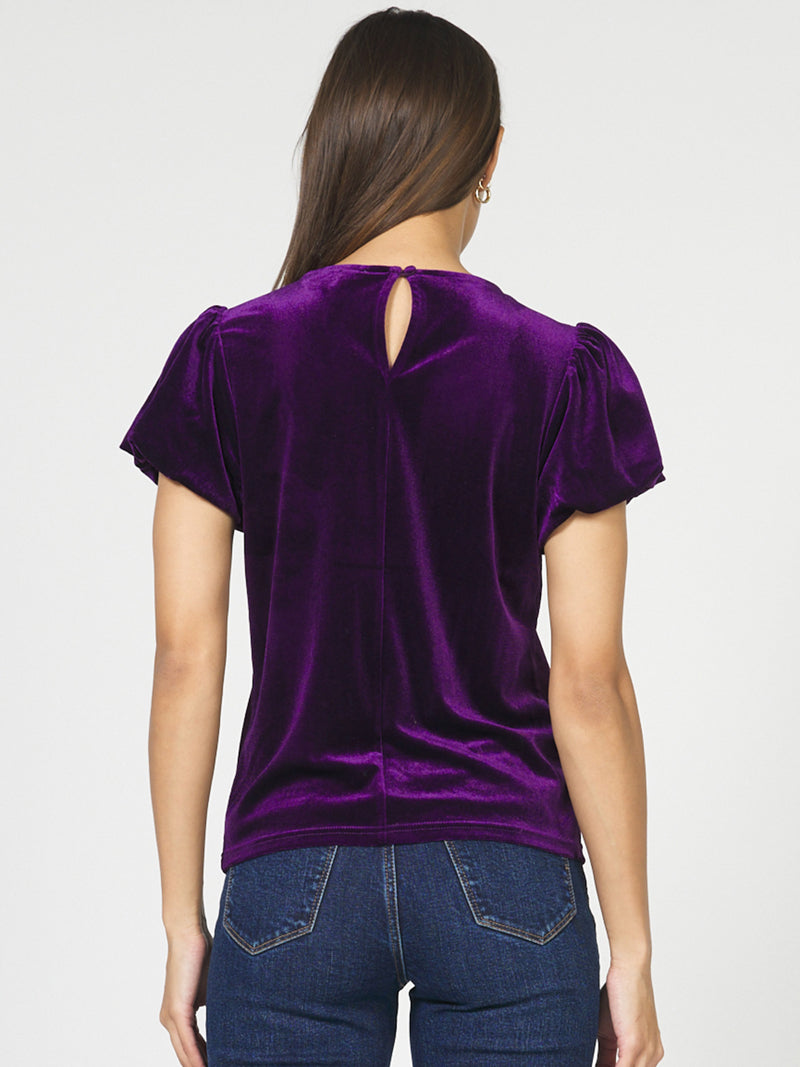 Mesmerizing in a deep, jewel toned purple, this soft velvet crew neck top brings a touch of sweetness to everyday style. Short puff sleeves add a gentle volume, balancing cozy texture with a hint of romance.