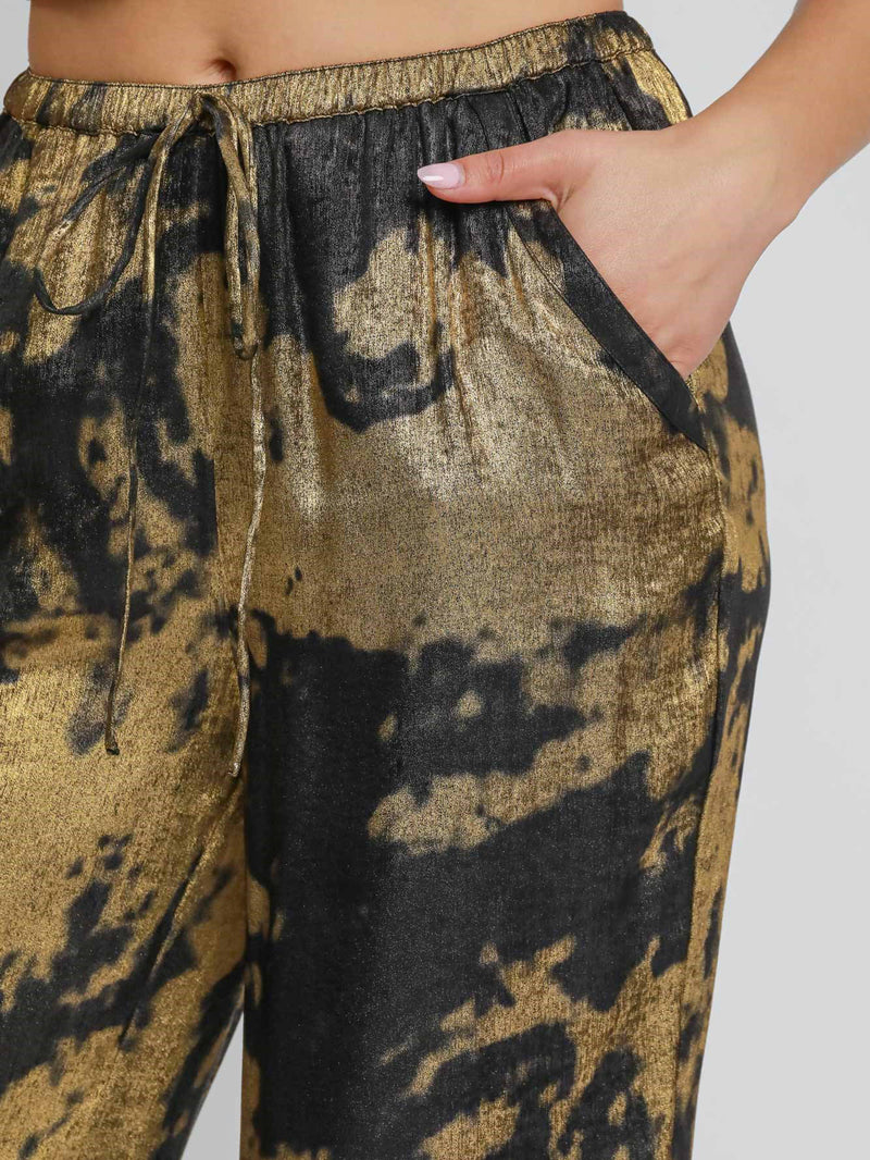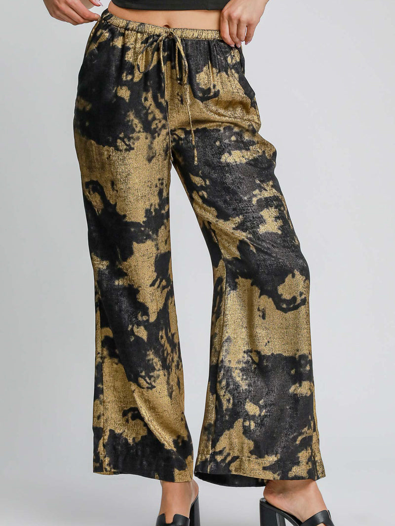 Shine bright and move freely! These gold and black metallic wide-leg pants feature a comfy drawstring waistband—perfect for dancing, lounging, or turning heads wherever you go.