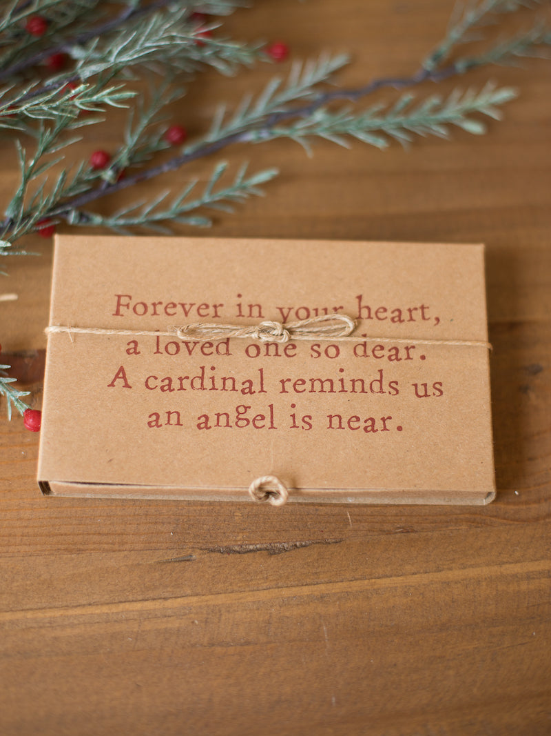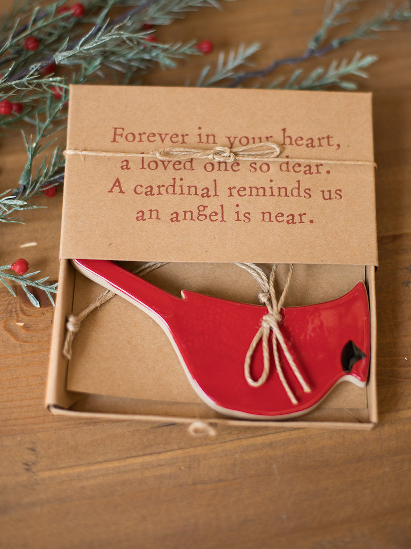 Celebrate your loved ones this holiday season with this heartwarming red cardinal ornament. The hand-painted ornament comes in a gift box that reads, "Forever in your heart, a loved one so dear. A cardinal reminds us an angel is near." It's the perfect holiday gift to cherish and remember those who are always close to your heart.