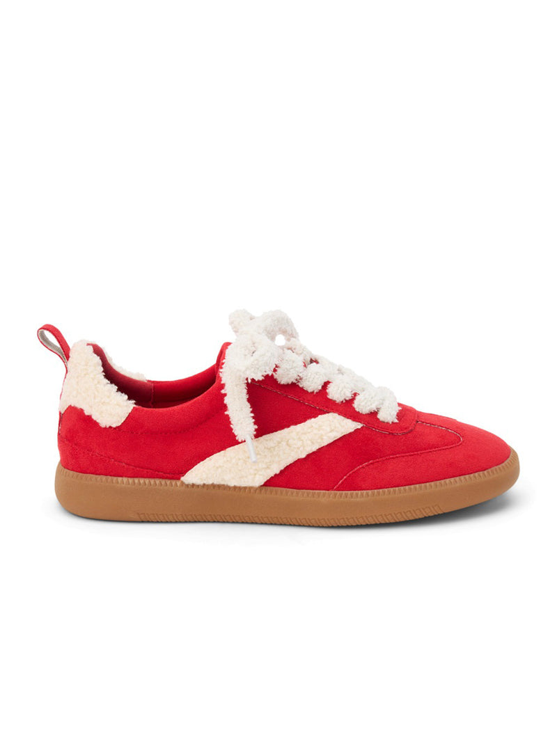 Step out in cozy-chic style with these red low top, faux suede sneakers—complete with plush white laces and soft trim that add a touch of festive charm to your everyday look.