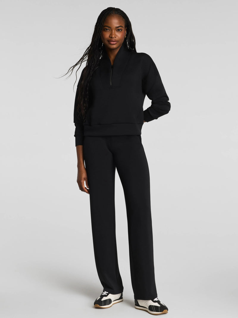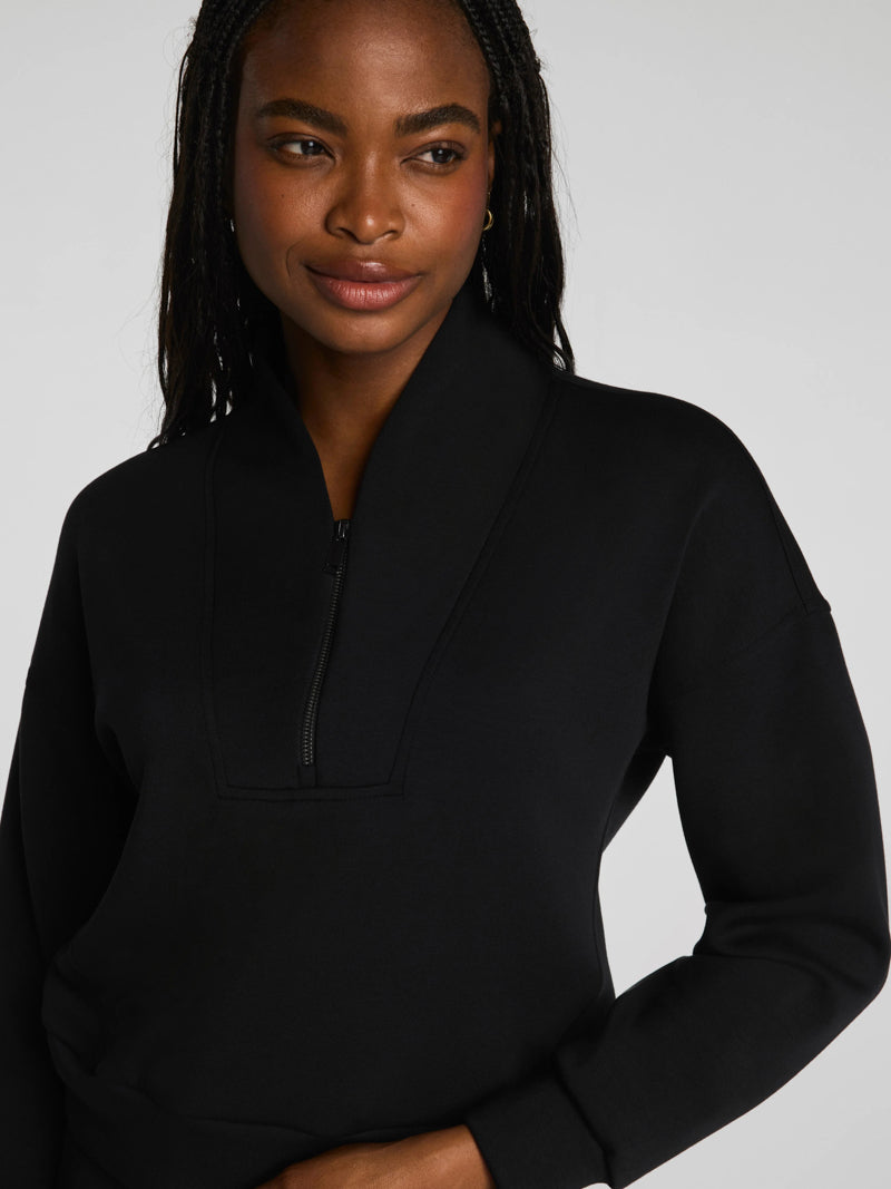 This Spanx AirEssentials® half zip pullover is crafted from a signature spacer fabric that’s light-as-air, cloud-soft, and oh-so-smooth. Features a sophisticated shawl collar with a relaxed fit and 4-way stretch. Comfortable, sporty and elegant to wear for lounge, exercise, and day wear.