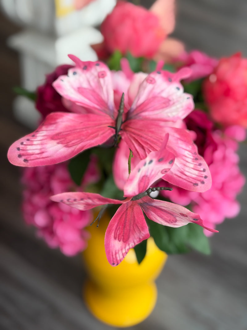 Delicately designed with soft pink butterflies perched along a graceful stem, this vibrant, decorative spray brings a colorful, airy touch to any space. Add this 32-inch pick to brighten up potted plants, floral arrangements, wreaths, or seasonal centerpieces.