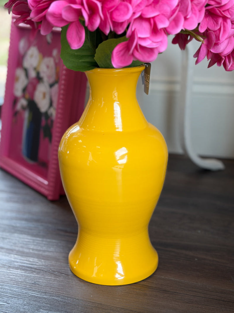 Add a burst of sunshine to any room with this yellow flower vase. Twelve inches tall and featuring a cheerful finish and a sleek, versatile shape, this vase is perfect for showcasing fresh blooms, faux florals, or seasonal arrangements.
