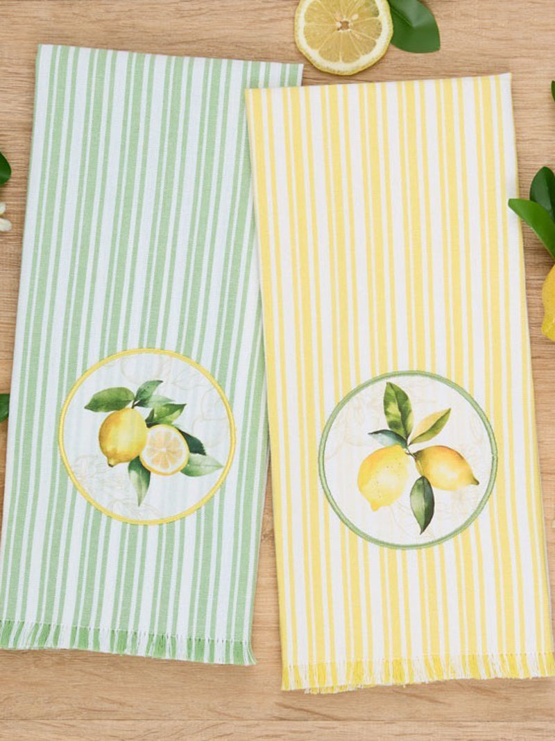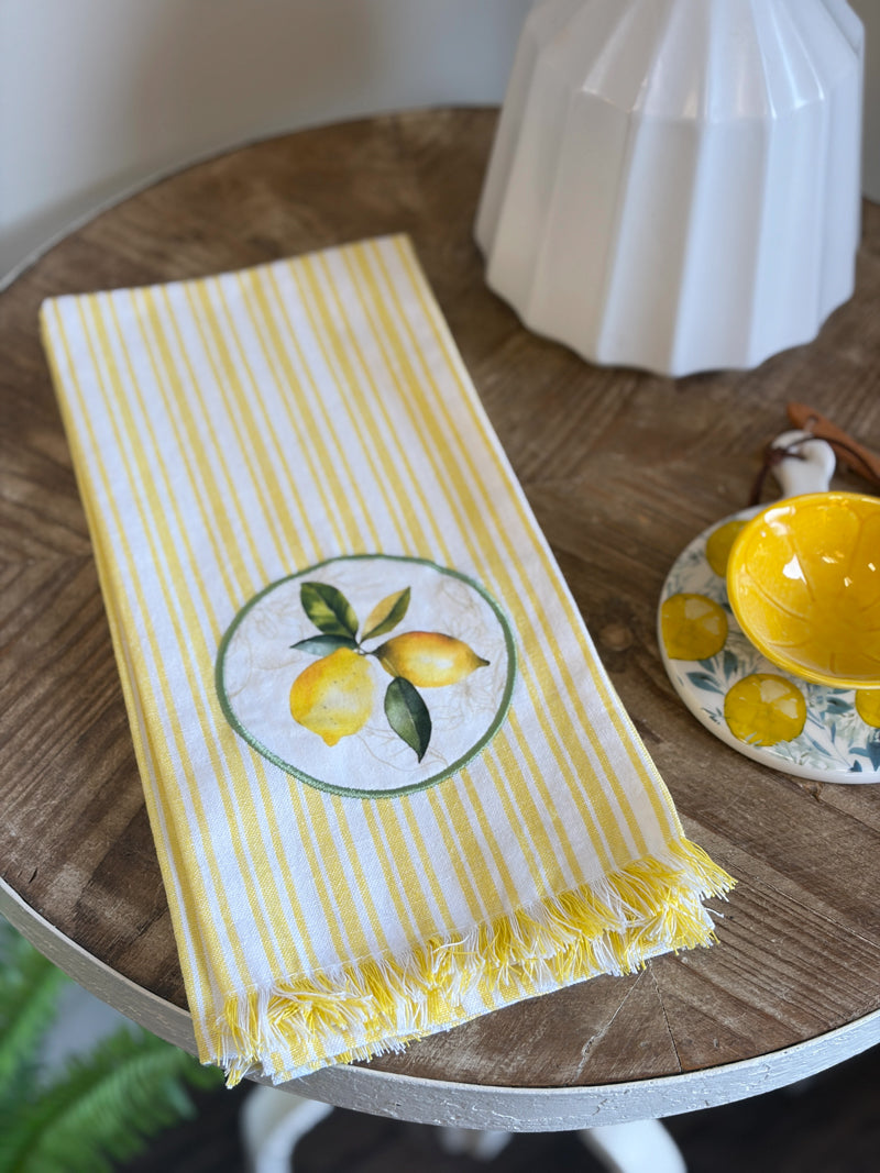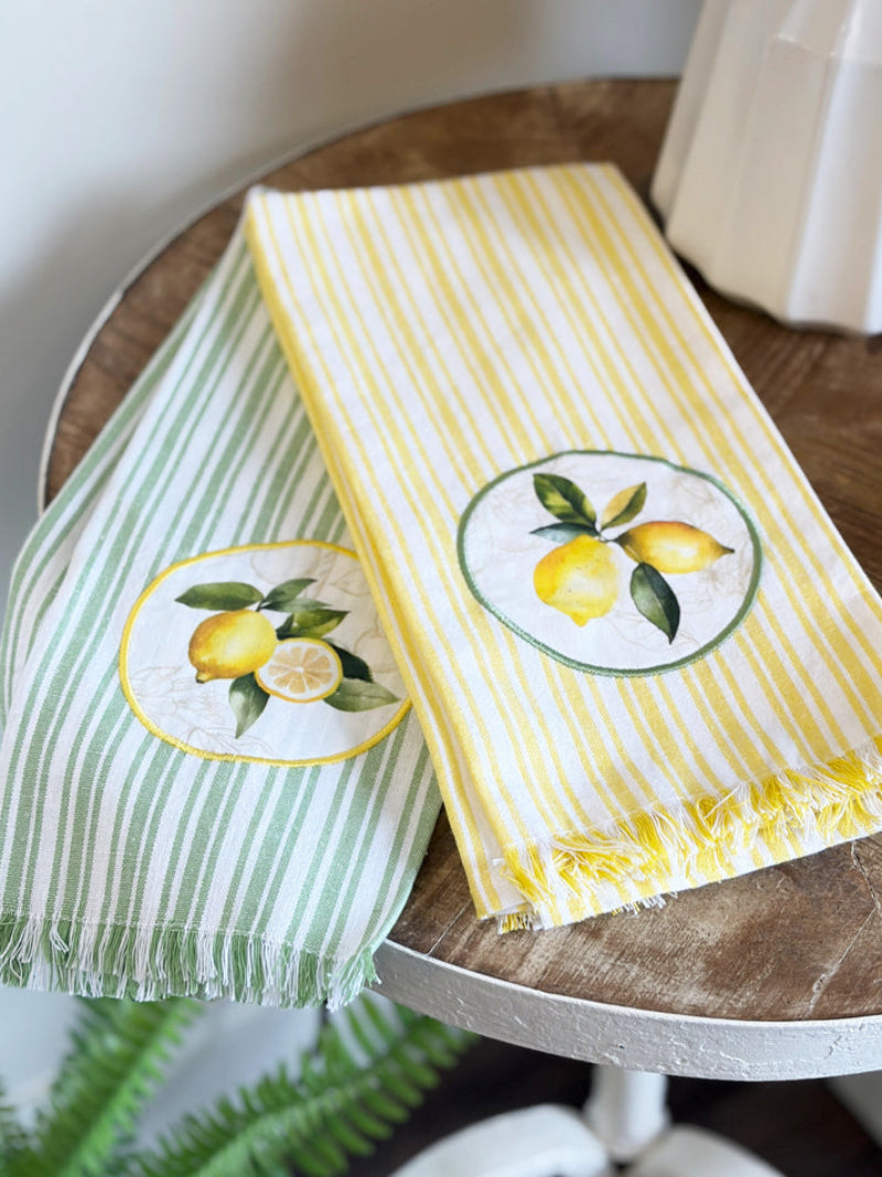 These striped dish towels bring a fresh, relaxed feel to your kitchen, highlighted by a sunny lemon motif for a pop of citrus charm. The softly frayed hem adds a touch of laid-back texture, giving it that perfectly worn-in look.