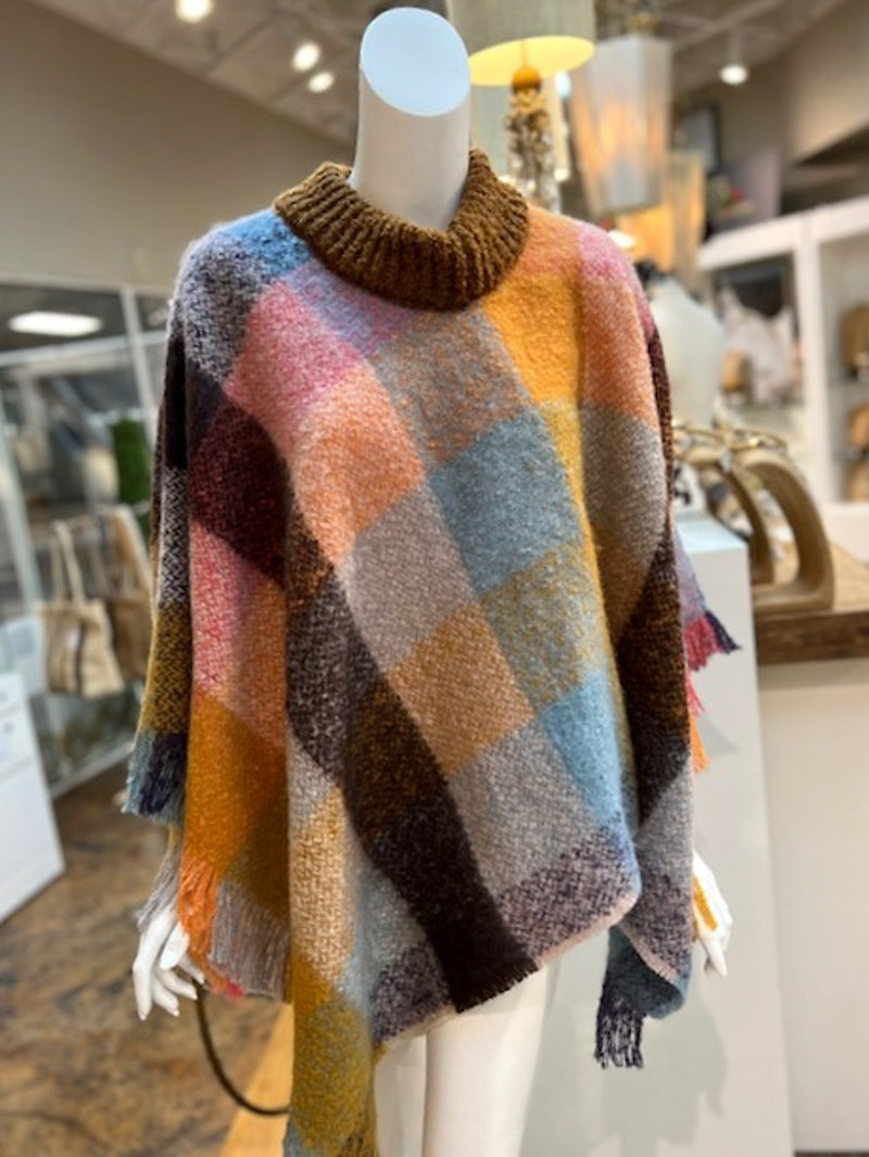 Immerse yourself in the elegance of this cozy, multicolored plaid wool poncho, featuring a brown mock neck and fringed hem. It's an ideal addition to your wardrobe, providing a chic, warm look that's perfect for any occasion. Wear it two ways for different looks!