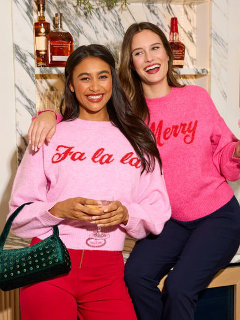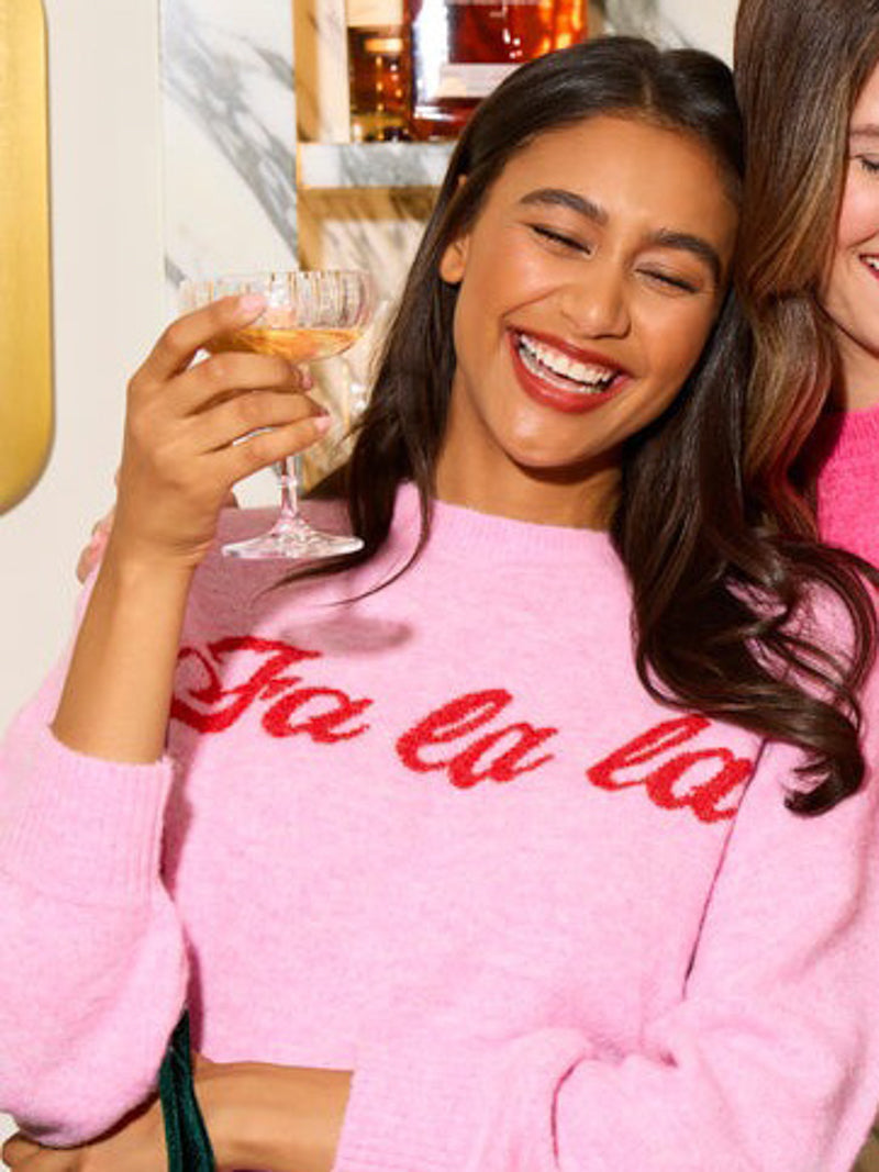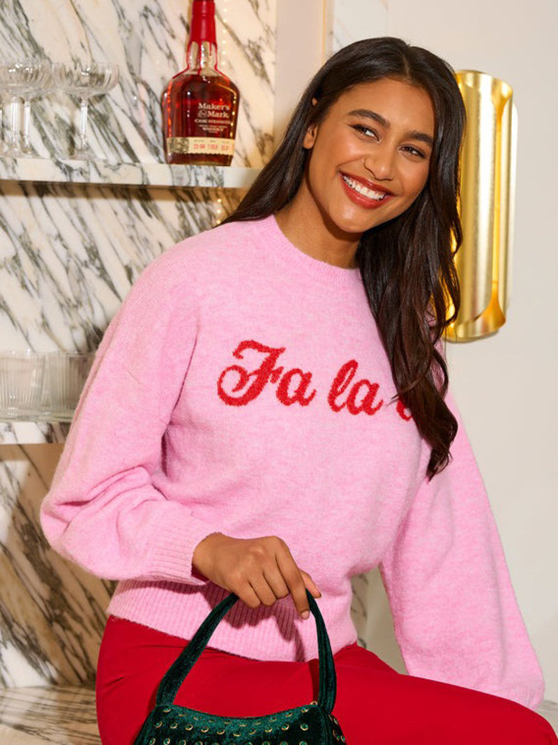 Get into the holiday spirit with this soft "Falala" sweater, your new festive favorite in a cheerful, light pink hue. With soft, cozy fabric and playful red lettering across the chest, this cute sweater hits just the right note.