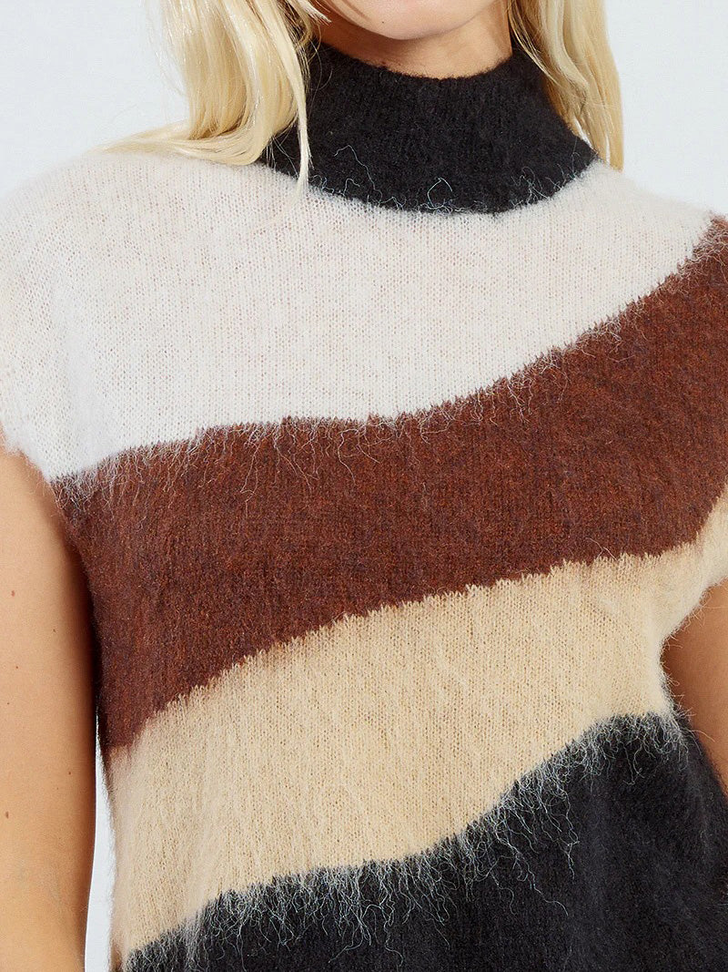 Elevate your layers with this neutral-toned, abstract striped sleeveless sweater, crafted in a soft, fur-like brushed mesh that feels as airy as it looks. With a mock neck and a warm palette of ivory, tan, brown and black, this piece gives poised sophistication in an effortless silhouette.
