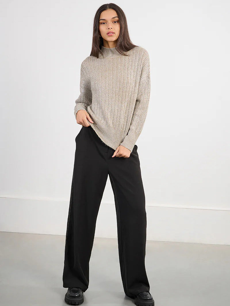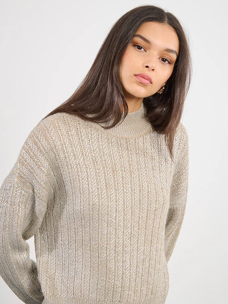A cozy classic with a hint of shimmer, this taupe beige, diagonal rib knit sweater stands out with its subtle metallic finish, dropped shoulders, and relaxed fit. Long fitted rib cuffs and a mock neck collar add stylish polish to this effortlessly chic top.