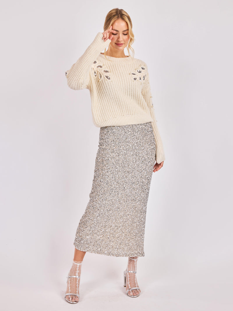 Shine through sweater weather in this leaf cutout embellished sweater. This cream knit beauty features sparkling silver sequin leaf cutouts, long sleeves, ribbed details, and a round neckline.